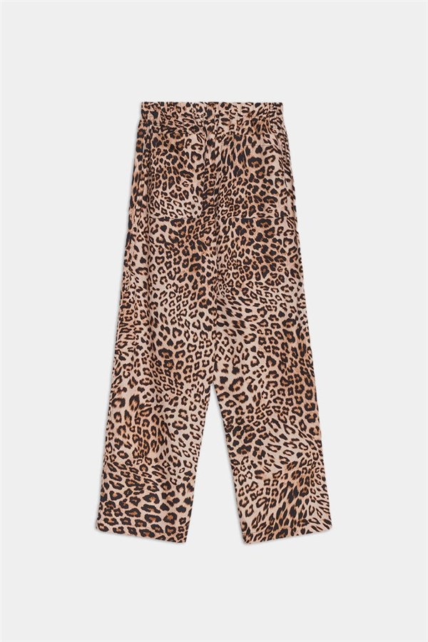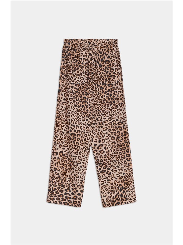 Pantaloni a gamba dritta in tessuto stampato animalier maculato. Vita elasticizzata con chiusura frontale a bottone e zip nascosta. Linea minimal dal fit rilassato, pensata per un look deciso e contemporaneo.