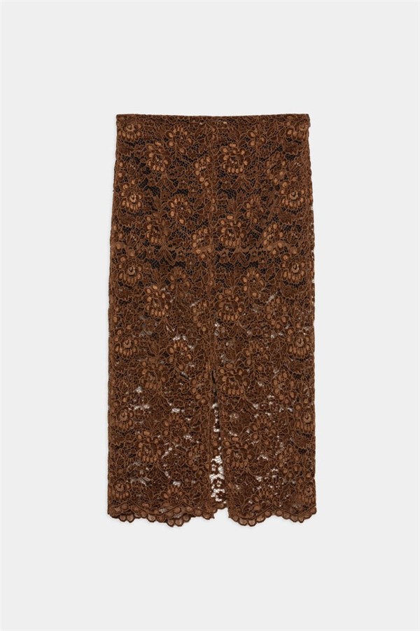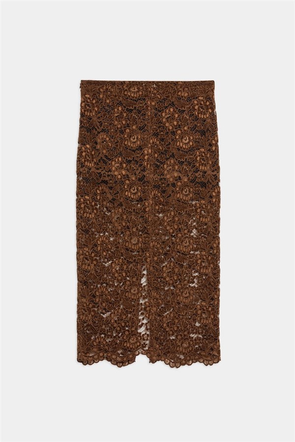 Gonna a tubino in pizzo con spacco sul retro. Caratterizzata da sottogonna più corto che crea un elegante gioco di trasparenze. Linea aderente che valorizza la silhouette con un fit femminile e sofisticato.