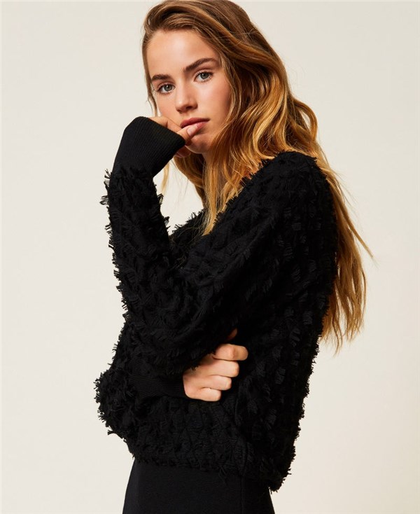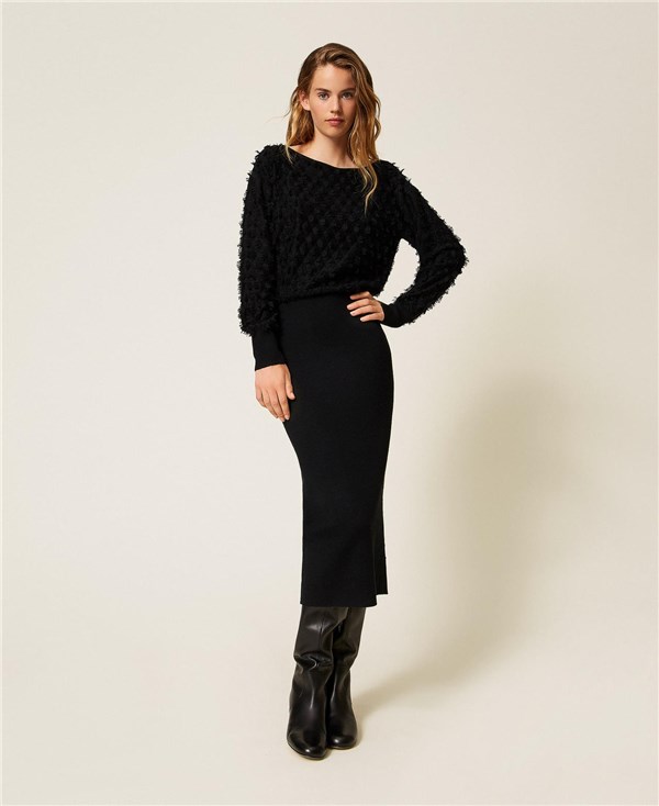 Abito longuette collezione Actitude in maglia con lavorazione a rombi e applicazione di piccole frange. Ha scollo a barchetta, maniche lunghe, placchetta logo sul retro e linea dritta.