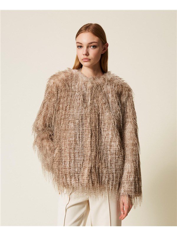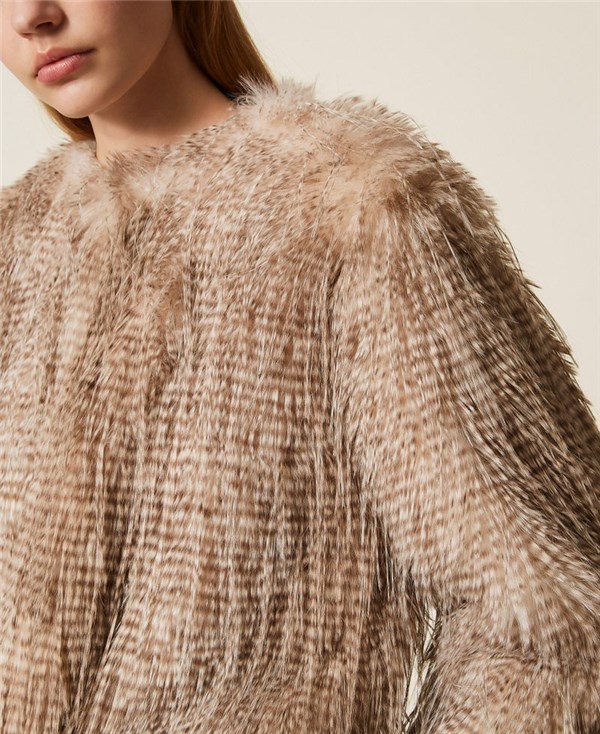 Giacca corta collezione Actitude in pelliccia sintetica lunga effetto struzzo con stampa sfumata. Ha scollo tondo, chiusura con ganci davanti, tasche inserite ai fianchi, fodera interna e linea dritta.