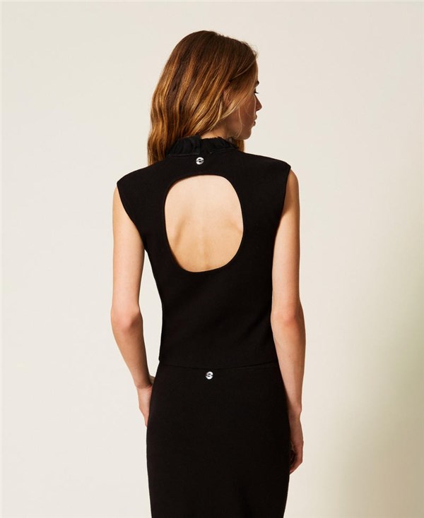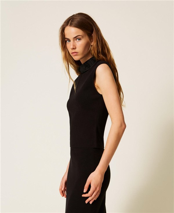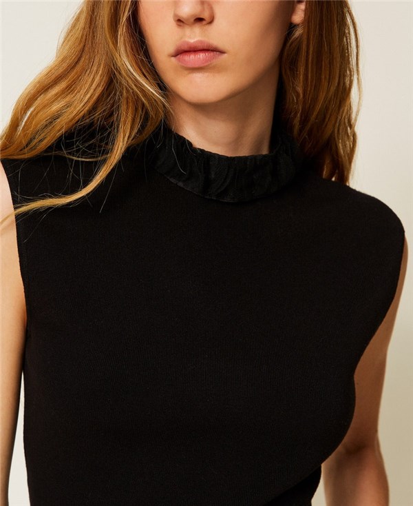 Top lupetto collezione Actitude in maglia di misto viscosa con applicazione di dischi in organza rimovibili al collo, placchetta logo sul retro e linea fitted.