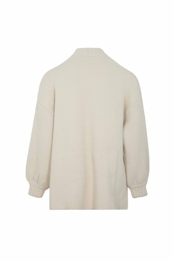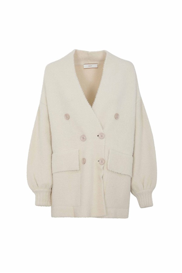 Cappotto bouclé, con chiusura doppiopetto, tasche applicate e maniche balloon. Picot morbido, caldo e perfetto per look femminili e cozy di stagione.