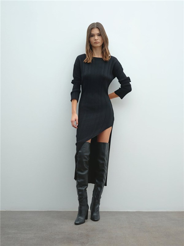 Abito lungo in maglia a costine con profondo scollo sulla schiena e laccetto che parte dalla nuca con terminalini logati. Vestibilità aderente e silhouette sensuale, ideale per look serali dal design essenziale.