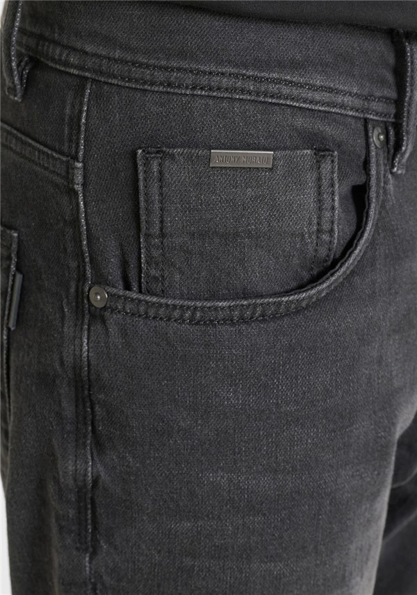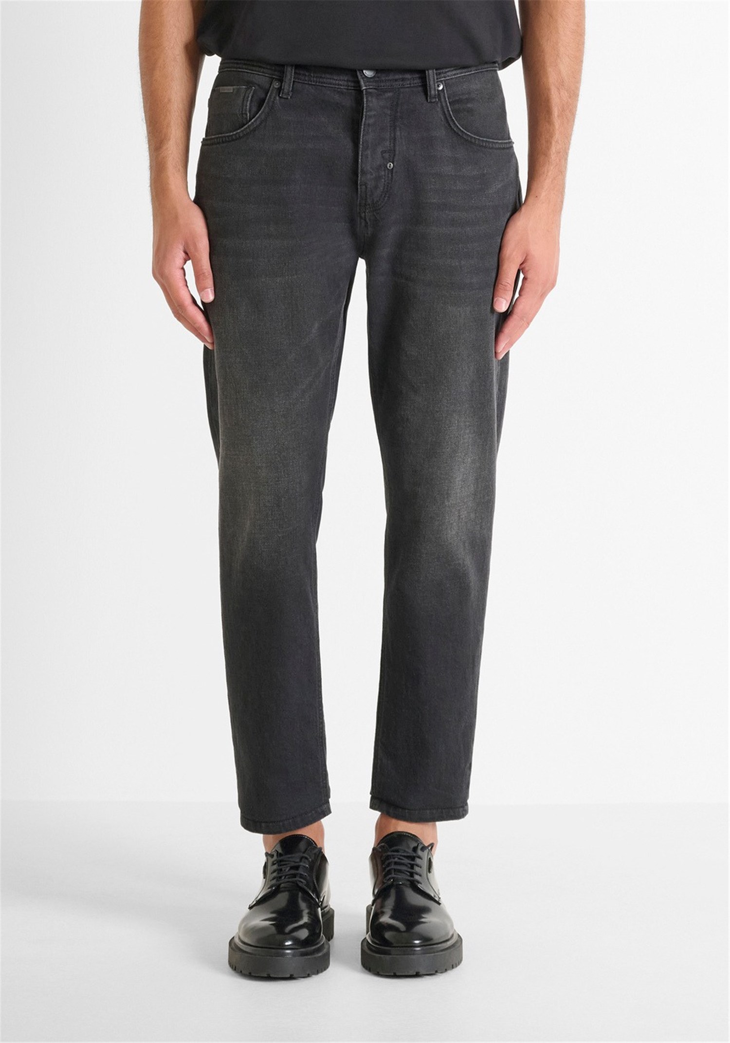 Jeans "Argon" cinque tasche slim ankle length. La vestibilità di questo modello offre quindi un comfort nella parte superiore, per poi evolvere in una linea più affusolata a livello del ginocchio e un fondo con lunghezza alla caviglia. Realizzato in tessuto denim morbido e confortevole di colore nero, con baffature e una sfumatura leggera. Cuciture tono su tono, chiusura con zip e bottone. Patch logata applicata sul retro.