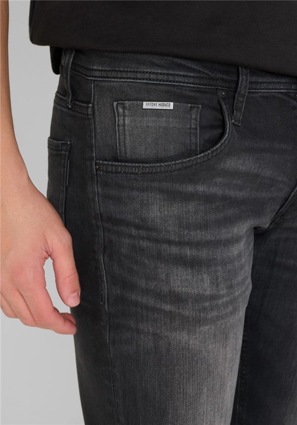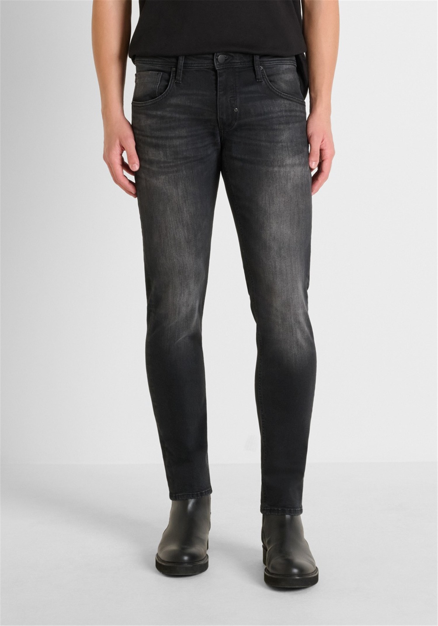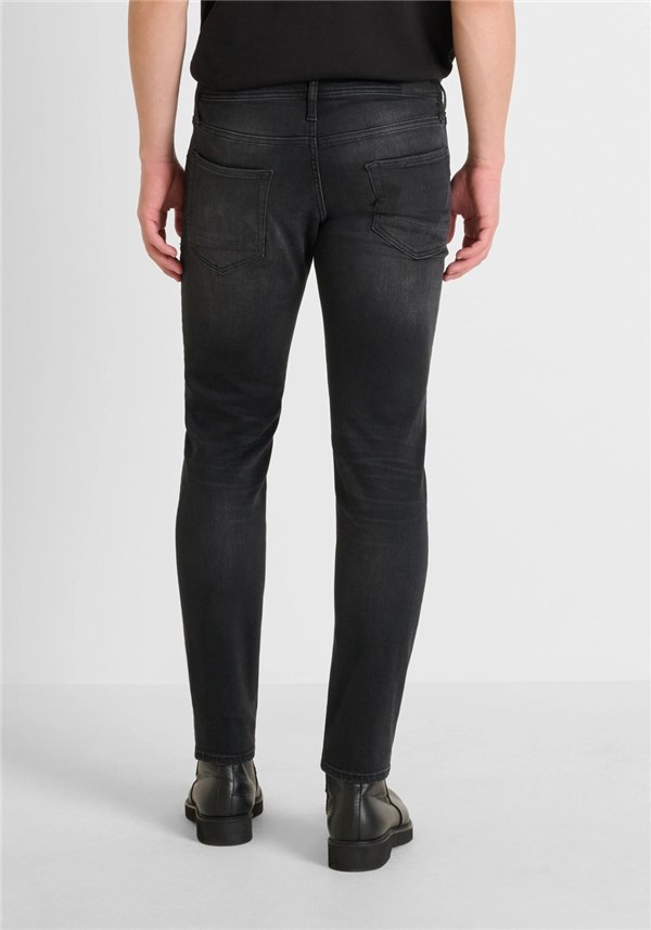 Jeans cinque tasche "Kurt" dalla vestibilità comfort tapered fit. Il modello è perfetto per chi desidera un denim dalla vestibilità aderente, ma rilassata, capace di valorizzare la silhouette restando comodo grazie alla morbidezza del tessuto. Colorazione nera con baffature e lavaggio sfumato. Lunghezza regolare, cuciture tono su tono, patch logata applicata sul retro.