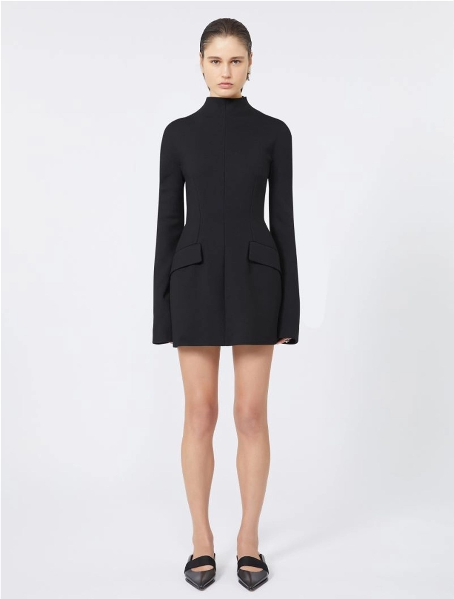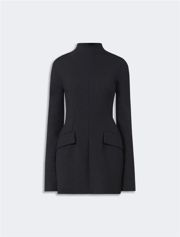 Abito corto dalla linea grafica, con sagomature che disegnano la silhouette enfatizzando i fianchi.