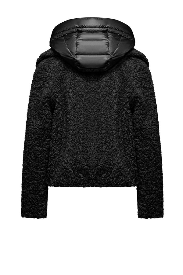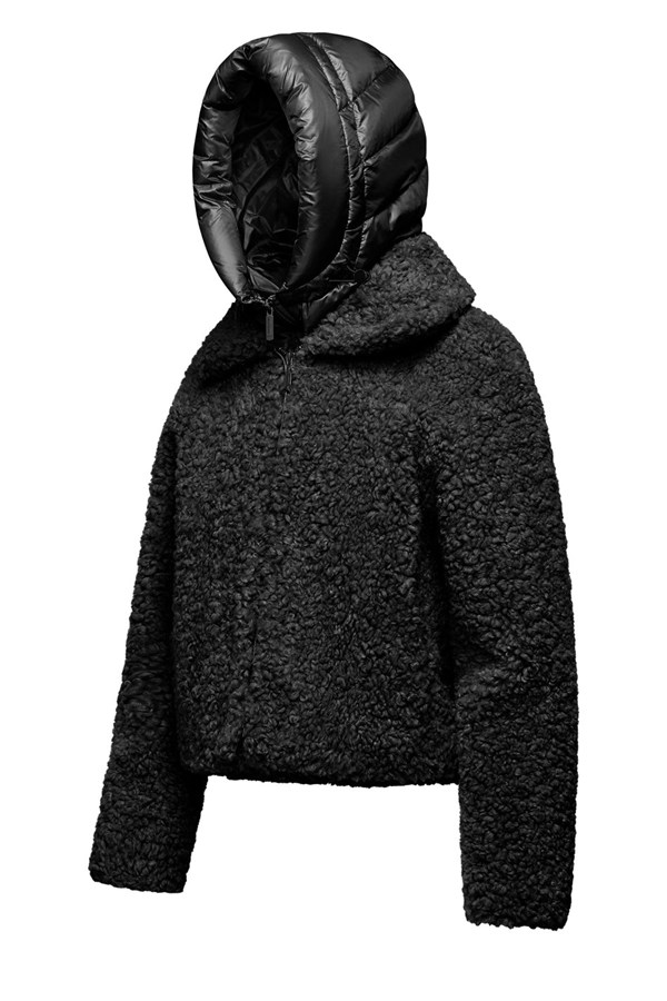 Il davantino è imbottito in vera piuma, composta per il 90% da piuma e per il 10% da piumino, con fill power 650, e garantisce calore e leggerezza, assicura comfort nei giorni freddi. Il cappuccio applicato alle parti in nylon, anch’esso imbottito con piuma, protegge da vento e pioggia grazie al trattamento water resistant.