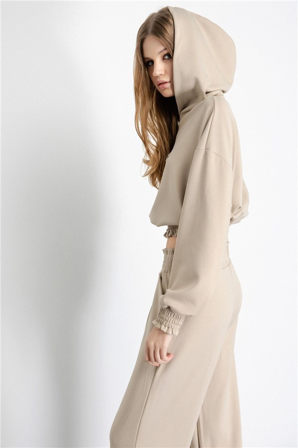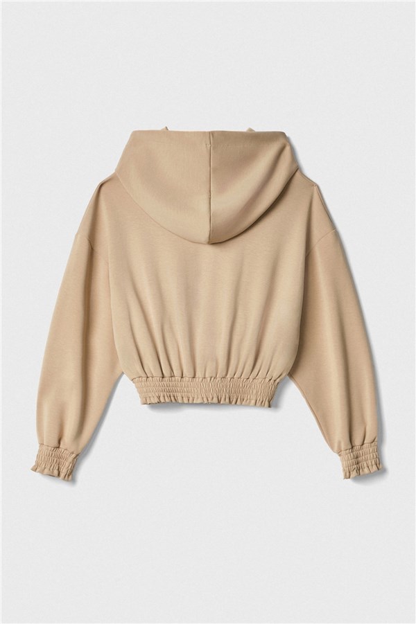 Felpa cropped con cappuccio realizzata in misto viscosa, tinta unita, si caratterizza per fondo e polsini punto smock, logo metallico applicato davanti.