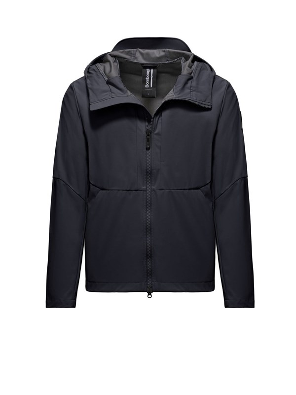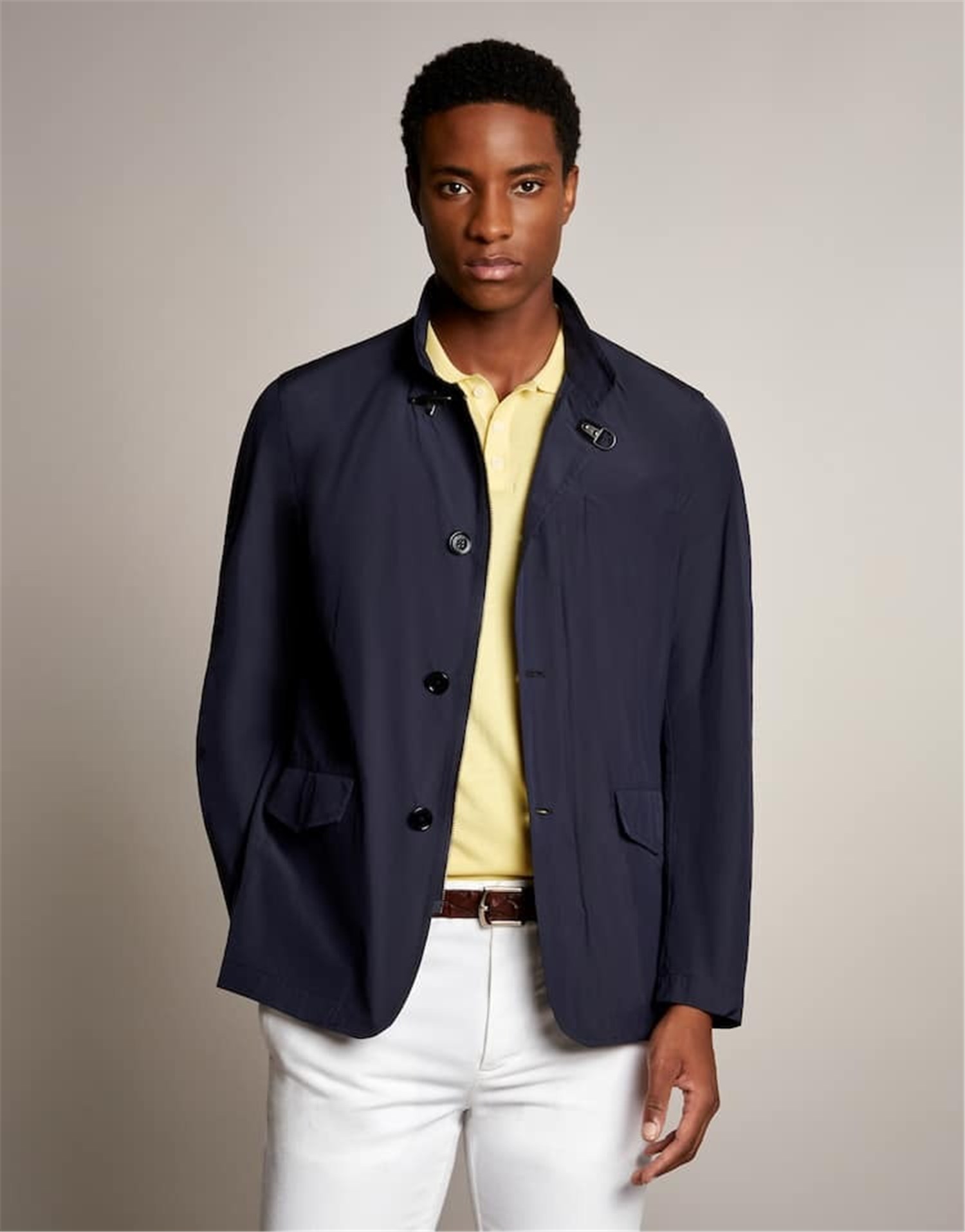 Eleganza e funzionalità convivono in questa giacca in taffettà tecnico impermeabile tinto in filo caratterizzata da un taschino pochette e tasche con patta. Chiusa con zip nascosta, bottoni e gancio Fay all'altezza del collo, è completata da una tasca interna.