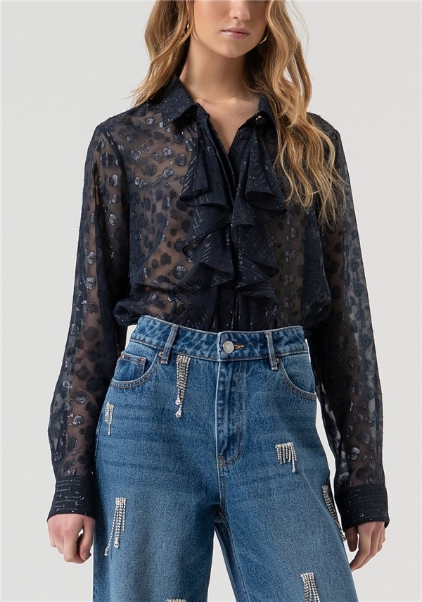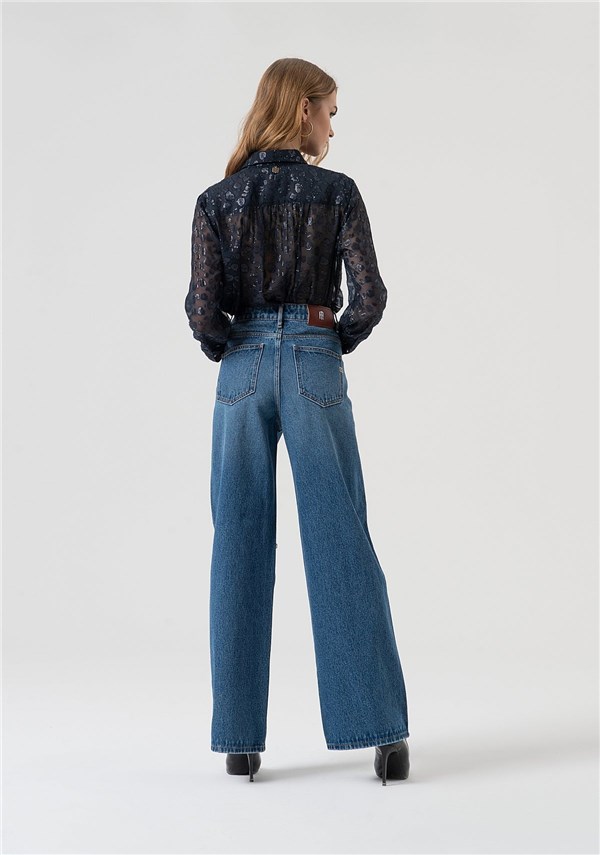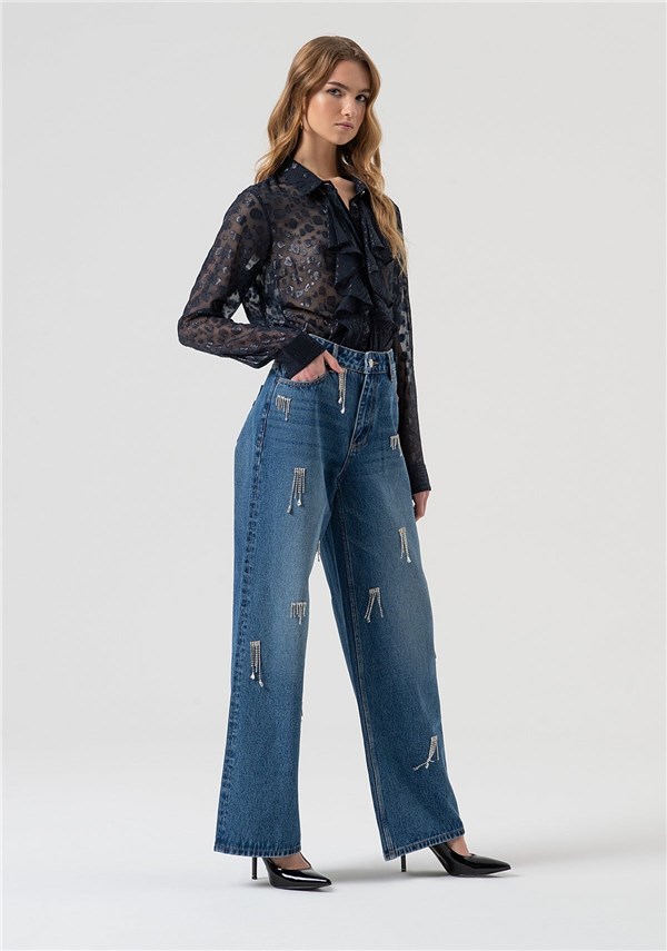 Jeans flare in denim con lavaggio medio e strass luminosi, vita regolare, 5 tasche, e con fondo largo.