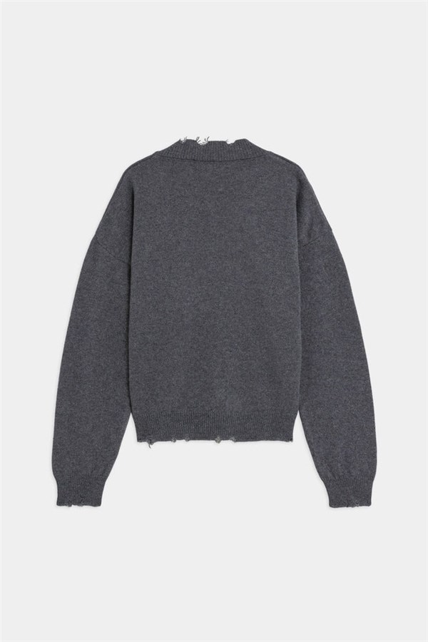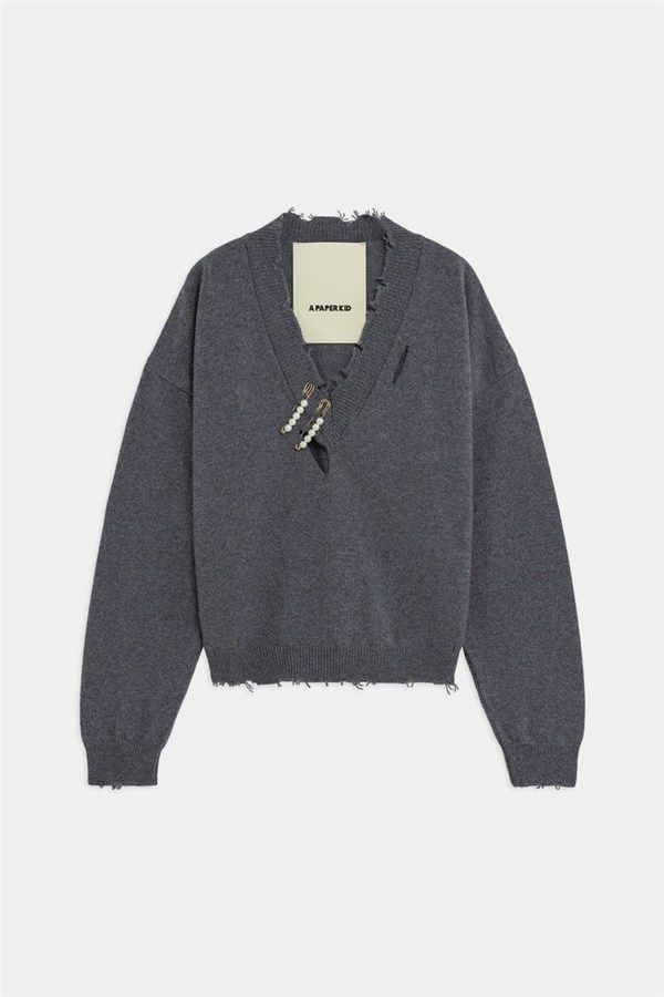 Maglione in maglia con scollo a V e dettagli di bordi sfrangiati con effetto destroyed. Arricchito da spille gioiello applicate sul davanti. Fondo e polsini a coste. Linea dal fit morbido con ispirazione grunge contemporanea.
