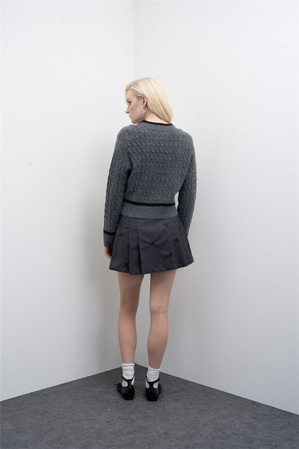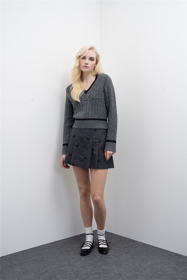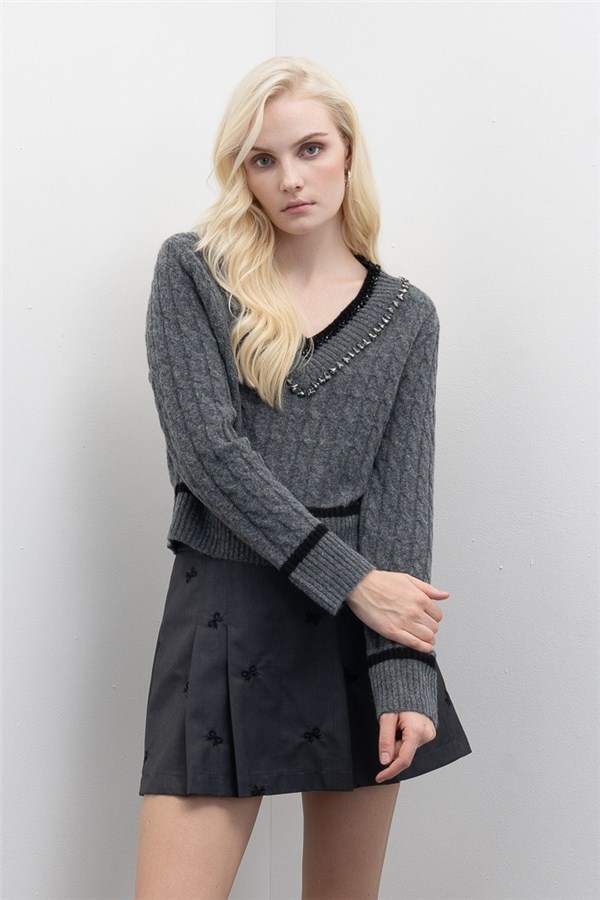 - Scollo a V decorato con dettagli di pietre e bordo a contrasto.