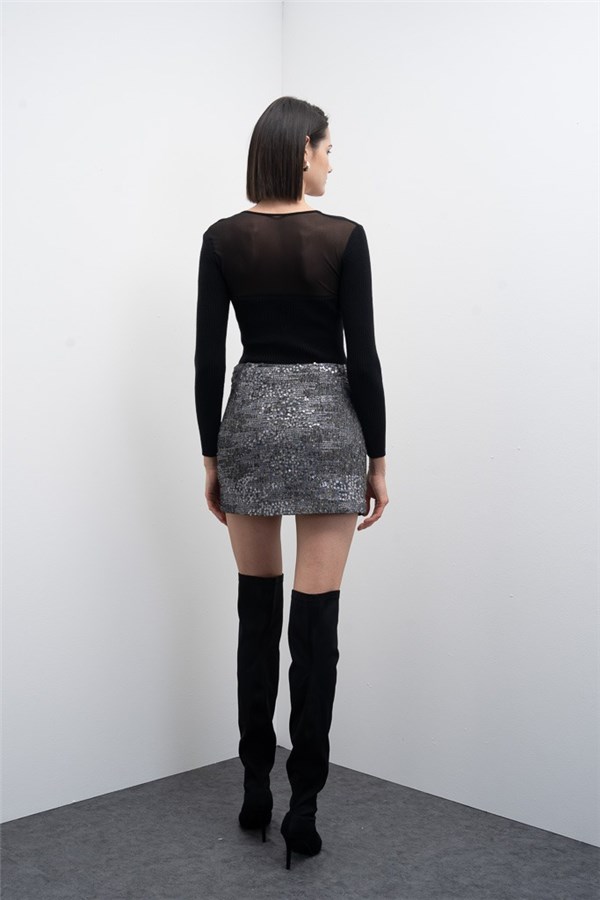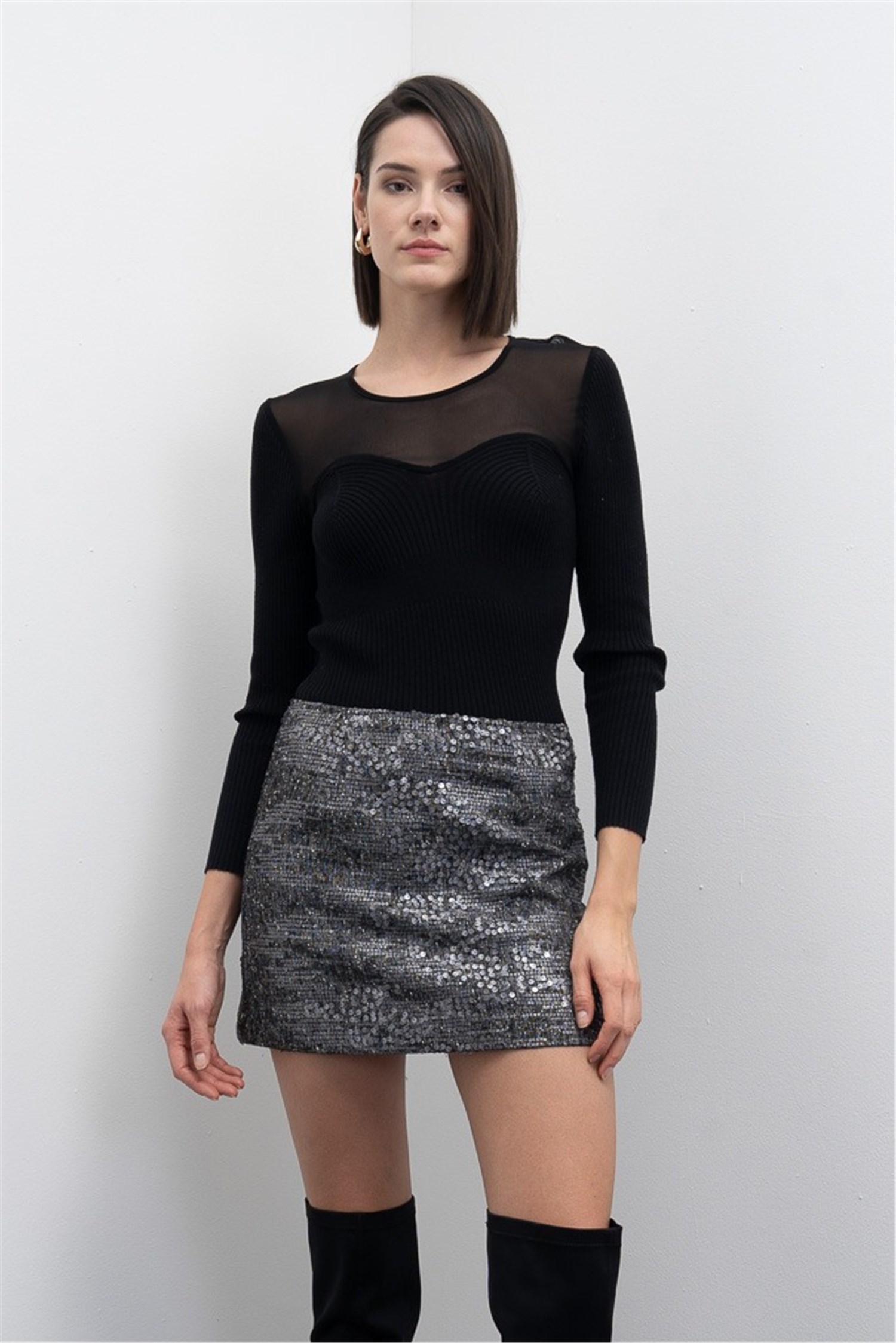 - Design con scollo rotondo e trasparenza sulla parte superiore.
