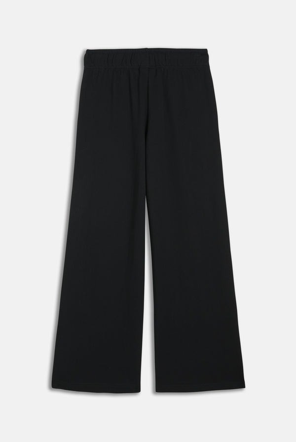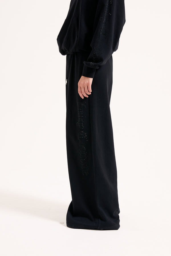 Pantalone in jersey nero dal taglio ampio e dritto, con vita elasticizzata regolabile tramite coulisse con finalini metallici. Sul lato della gamba presenta la scritta "Juicy Couture" realizzata in strass tono su tono, per un tocco glamour e discreto. Il design morbido lo rende ideale per outfit comodi ma sofisticati, perfetto per il tempo libero e per completare look streetwear.