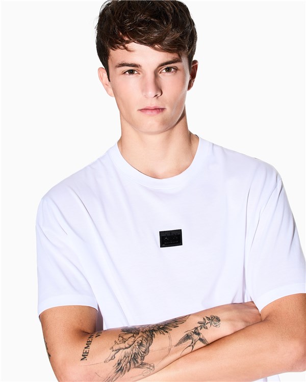 Modello girocollo realizzato in jersey di puro cotone, tinta unita, patch logo sul petto, regular fit