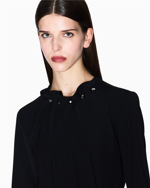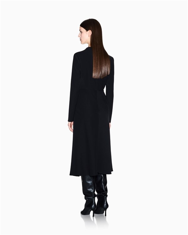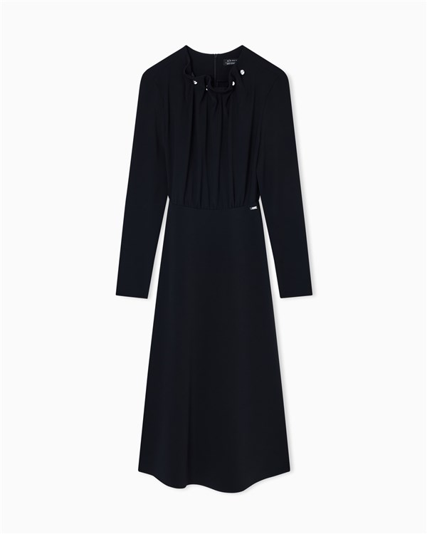 Abito midi caratterizzato da un design minimal e raffinato. Il modello presenta maniche lunghe e una linea leggermente svasata che cade morbida lungo la figura, valorizzando la silhouette con discrezione. Il dettaglio arricciato sullo scollo, impreziosito da bottoni decorativi, dona un tocco sofisticato e femminile. Perfetto per occasioni formali, eventi eleganti o cerimonie, si abbina facilmente a décolleté classiche o accessori minimal per un look senza tempo.