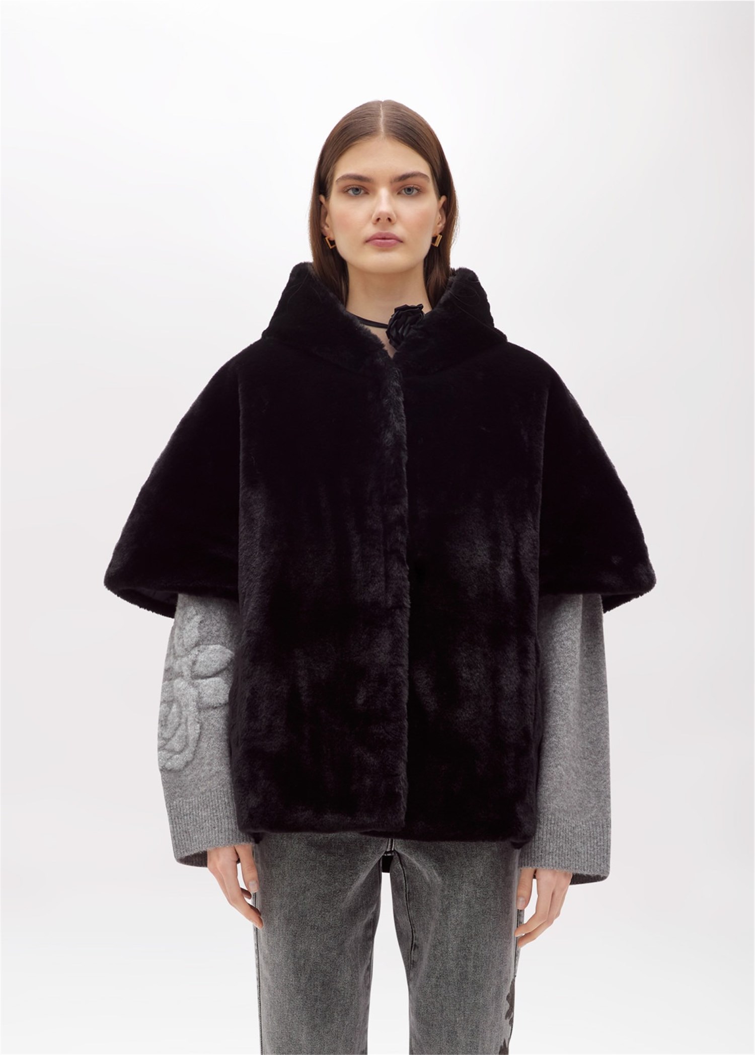 IL GLAMOUR IN STILE BLUGIRL SI TRADUCE IN QUESTA CAPPA REVERSIBILE IN FAUX FUR REALIZZATA CON COLLO ALTO E CAPPUCCIO, MANICHE CORTE, CHIUSURA MONOPETTO CON BOTTONI NASCOSTI, TASCHE AI FIANCHI, FODERATA. ATTITUDINE CHIC E URBANA PER COMPLETARE I TUOI LOOK SPECIALI.