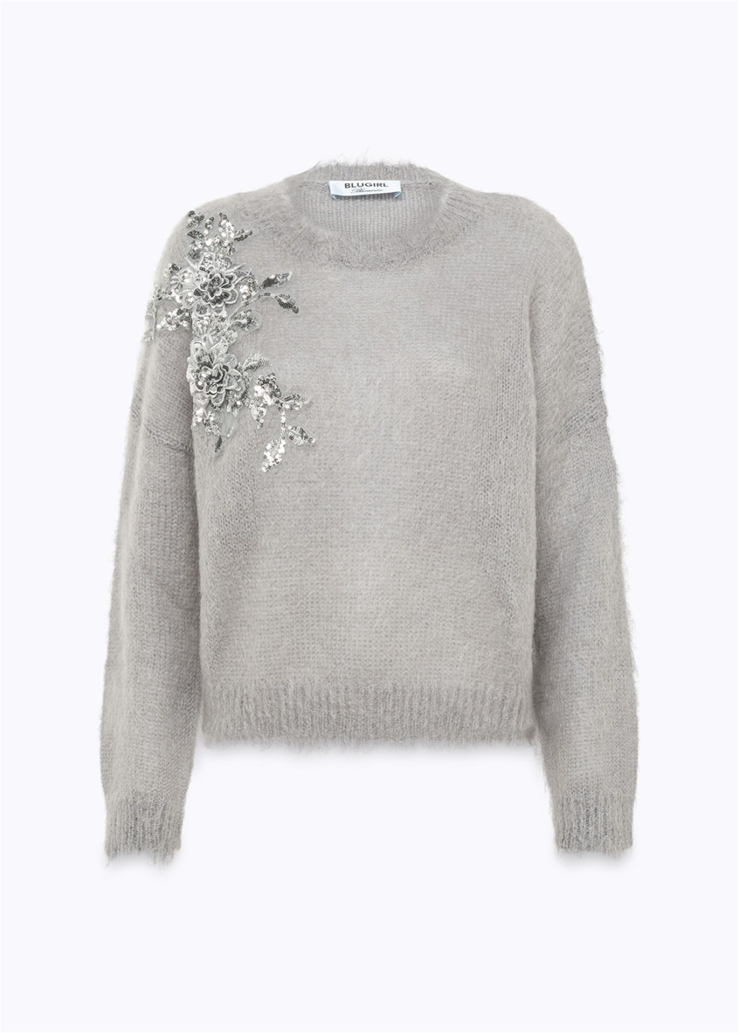 KNITWEAR BY NIGHT. MAGLIA IN MISTO MOHAIR CON PATCH FLOREALE TRIDIMENSIONALE CON RICAMO A FILO E PAILLETTES. HA COLLO TONDO, MANICHE LUNGHE, LINEA REGULAR. PERFETTA PER UN'OCCASIONE SPECIALE O PER ELEVARE LO STILE QUOTIDIANO.