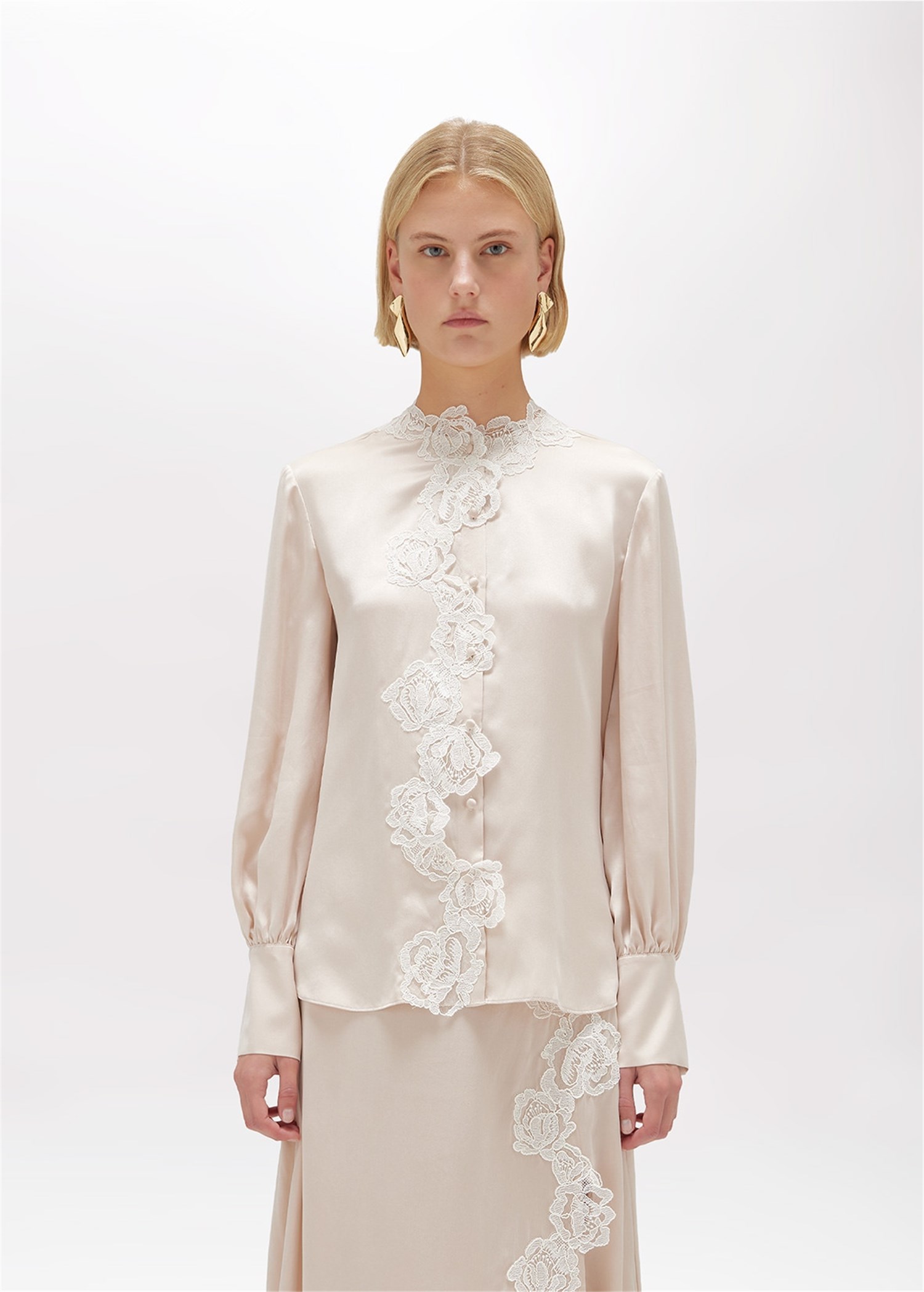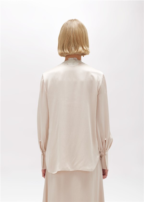 L'ELEGANZA FLUIDA DEL RASO DI SETA LAVATO TRASFORMA QUESTA CAMICIA IN UN PEZZO SEMPRE SOFISTICATO. È IMPREZIOSITA DALL'APPLICAZIONE DI PIZZO FLOREALE A FORMA DI ROSA. HA LINEA DRITTA PIÙ LUNGA SUL RETRO, COLLO A SOLINO CON SMERLO, CHIUSURA CON BOTTONI RICOPERTI, MANICHE LUNGHE CON POLSO ALTO E BOTTONE RICOPERTO. BASTA INDOSSARLA PER ELEVARE OGNI TUA MISE.