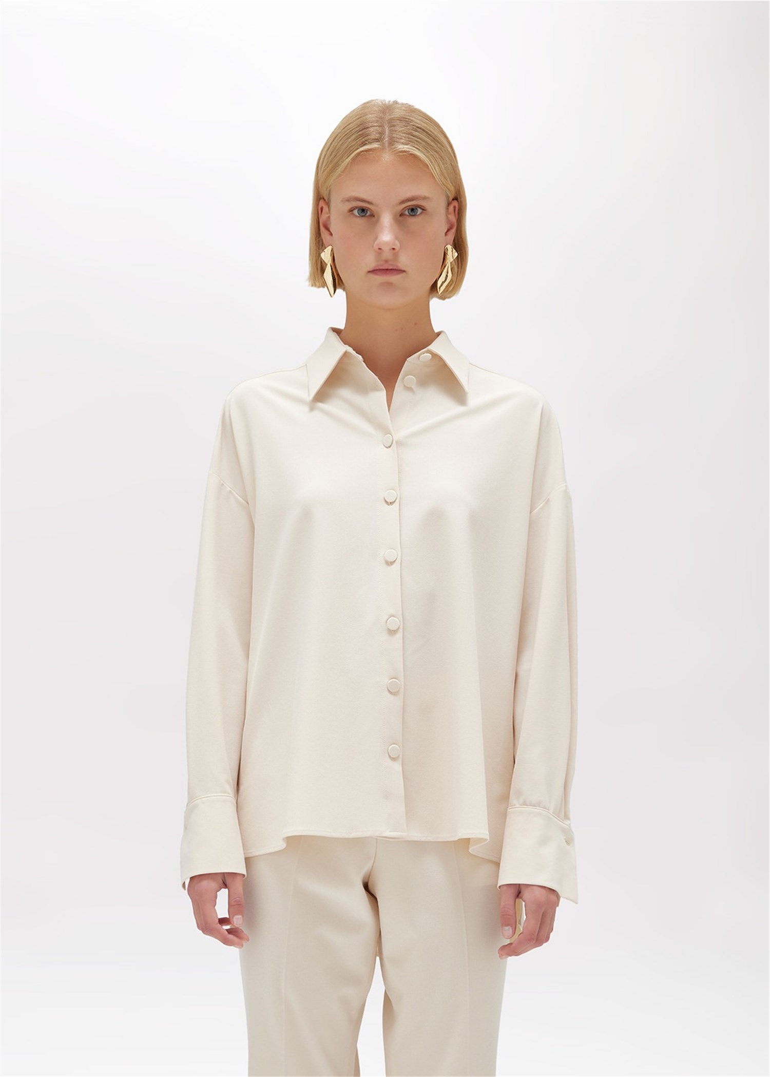 ATTITUDINE SARTORIALE PER LA CAMICIA IN FLANELLA STRETCH LEGGERA. HA CHIUSURA CON BOTTONI PIATTI RICOPERTI, MANICHE LUNGHE, CARRÉ SUL RETRO, FONDO ASIMMETRICO PIÙ LUNGO DIETRO. LINEA OVER PER COMPLETARE LO STILE CON UN TOCCO CONTEMPORANEO.