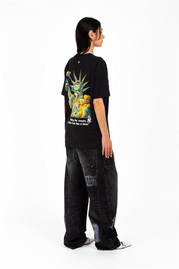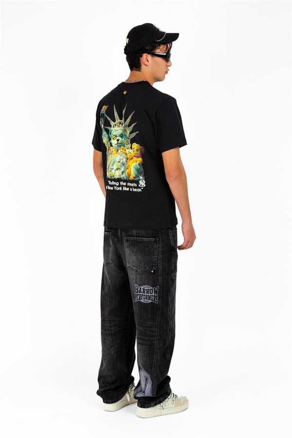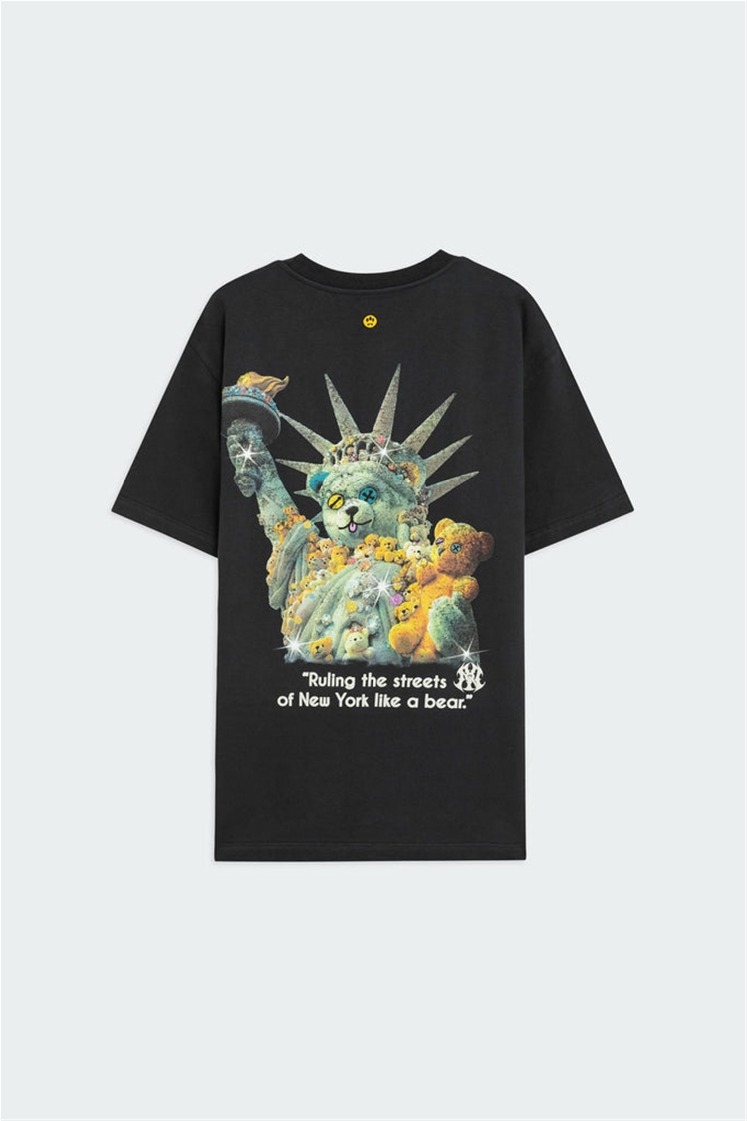 T-shirt in 100% cotone dal fit morbido con girocollo. Logo “BARROW HALL OF FAME” stampato sul petto. Stampa posteriore con la Statua della Libertà in versione orso accompagnata dalla scritta “Ruling the streets of New York like a bear.”. Dettaglio finale: label interna con logo e smile giallo sotto il colletto.