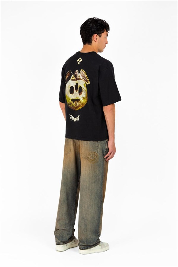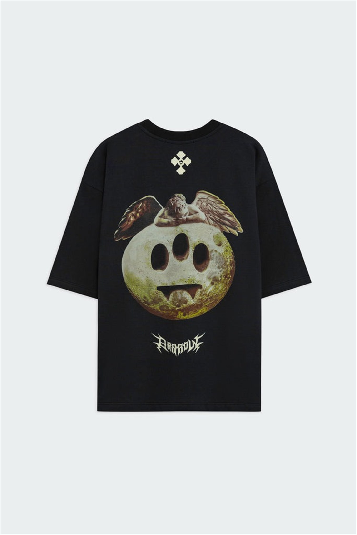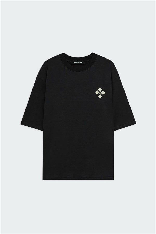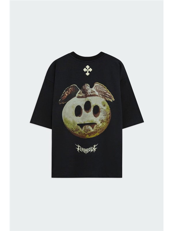T-shirt in 100% cotone dal fit morbido. Fronte con stampa geometrica minimal black tono su tono. Retro con grafica in stile gotico a contrasto.