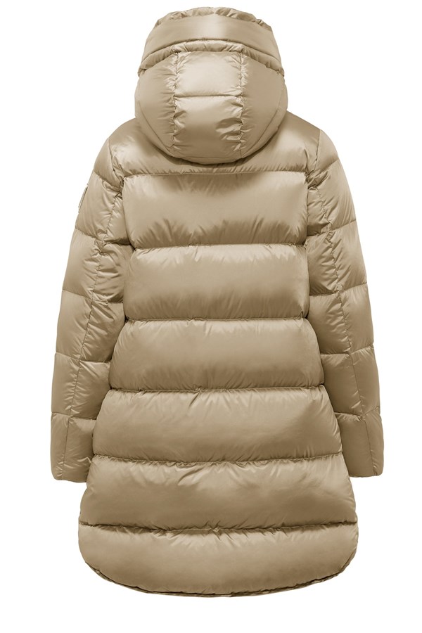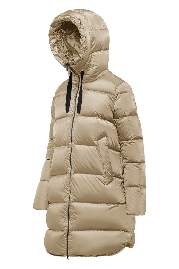 Il piumino lungo da donna è imbottito con vera piuma d’oca al 90% e piumino al 10%, con un fill power di 750, che garantisce calore elevato senza risultare pesante. La linea a “A” valorizza la figura e assicura comodità nei movimenti quotidiani. Il cappuccio fisso protegge dal freddo, mentre il tessuto con superficie lucida e finitura ciré mantiene un effetto brillante duraturo. La fodera interna in nylon, insieme al trattamento down proof, impedisce la fuoriuscita delle piume, preservando l’isolamento termico nel tempo.