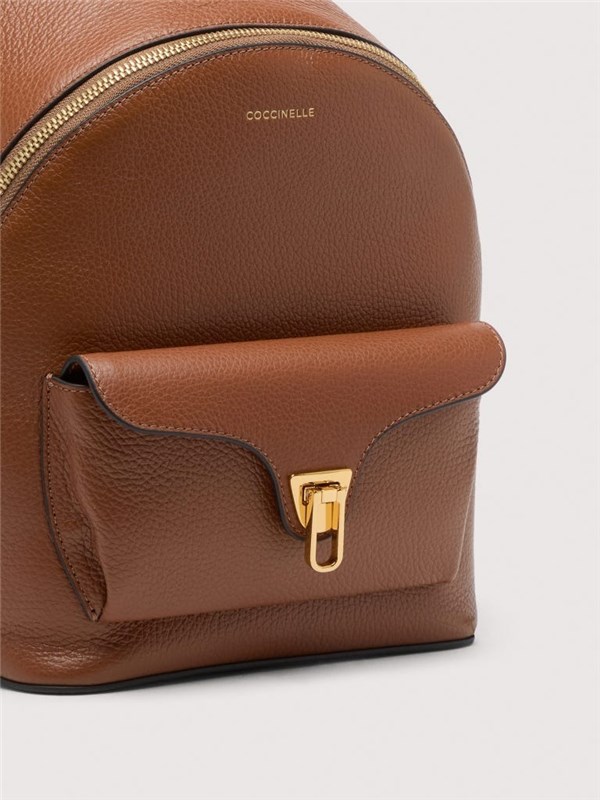 Coccinelle Beat è una tra le icone del brand: la distintiva chiusura a battente con il plettro è il simbolo d’identità Coccinelle, che per questa collezione si reinventa con funzionalità contemporanee ed eleganti. Lo zaino con chiusura zip è l'immancabile compagno di viaggio, un mix perfetto tra struttura e morbidezza, tra praticità e design contemporaneo. Questo modello è realizzato in pelle lavorata tramite specifici macchinari e poi bottalata al fine di mantenerne la morbidezza. È una pelle molto resistente che si presta a una facile pulizia, ideale per un uso quotidiano.