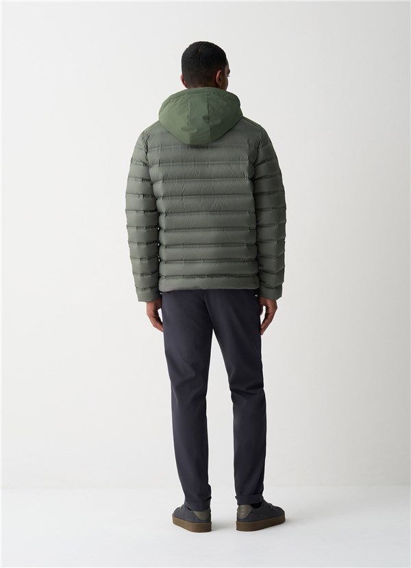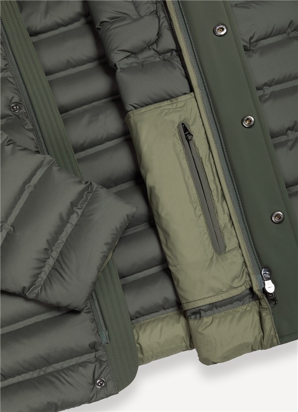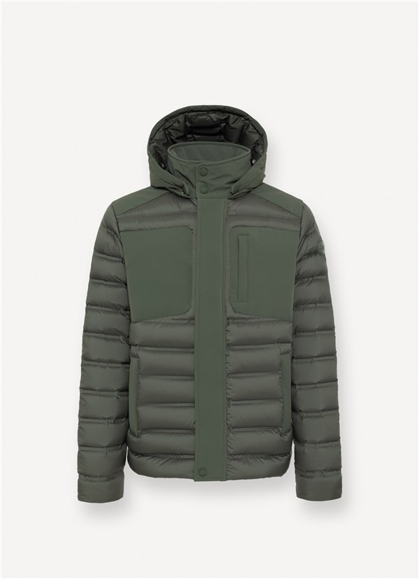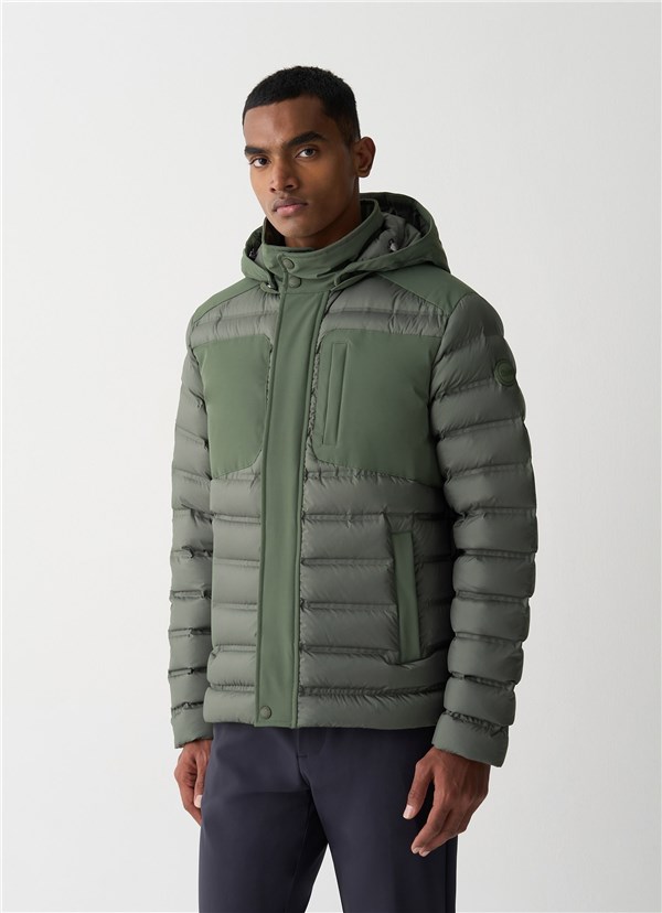 Gli inserti in tessuto liscio a tre strati si alternano alle trapuntature incollate, creando un mix di tecnicità e dinamismo. Il cappuccio staccabile permette di personalizzare il look, mentre le tasche laterali e quella sul petto aggiungono funzionalità. La coulisse sul fondo regola la vestibilità, garantendo comfort e praticità ideali per affrontare il freddo con stile.