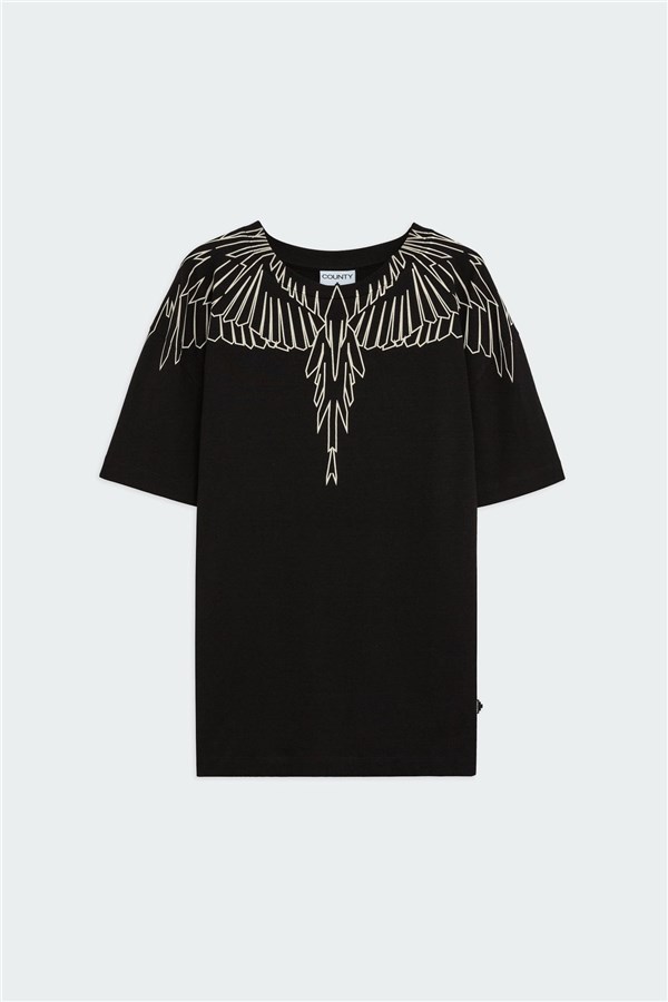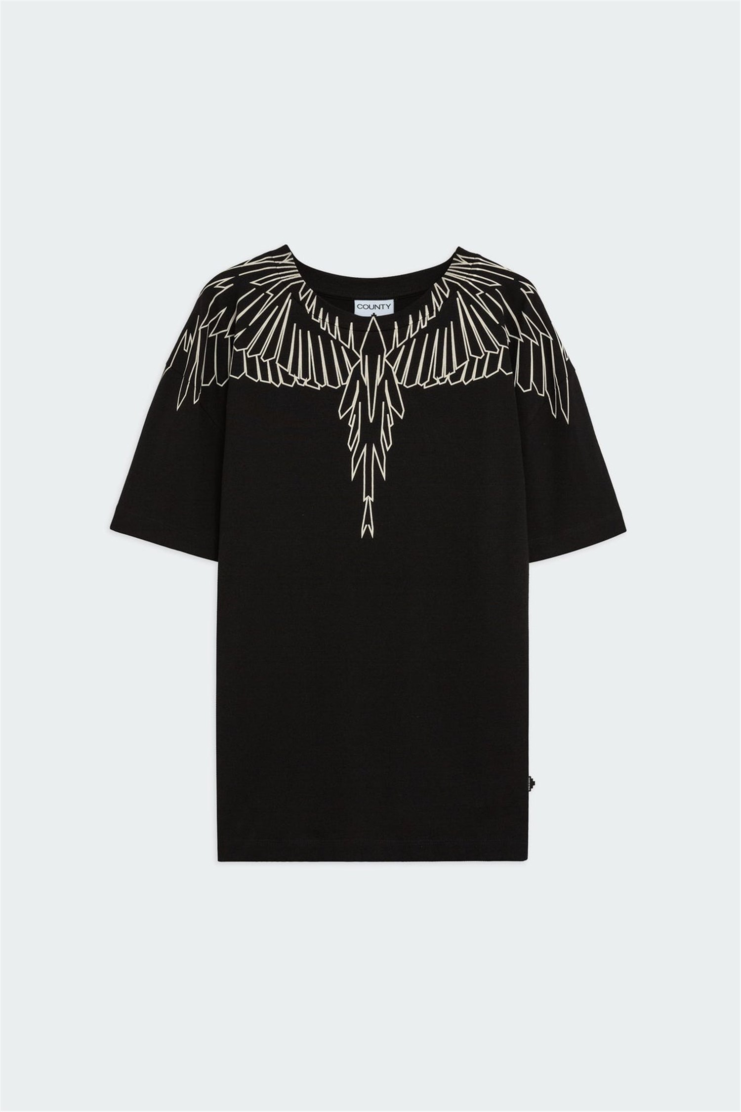 T-SHIRT IN 100% COTONE DAL FIT REGOLARE, CARATTERIZZATA DALL’ICONICA STAMPA “ALI LINEOUT COUNTY OF MILAN” CHE DECORA IL FRONTE E LE SPALLE. COLLO A COSTINE E LABEL CON EFFETTO 3D APPLICATA SUL FIANCO COMPLETANO IL DESIGN.