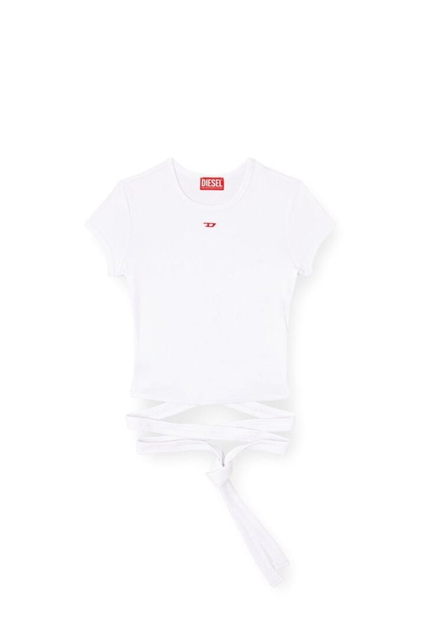 T-shirt aderente bianca da donna lavorata a costine in cotone biologico. La linea a maglietta viene rivisitata grazie alle fasce che si allacciano intorno al corpo, creando un cut-out sulla schiena. Una piccola patch a forma di D è ricamata sul petto.