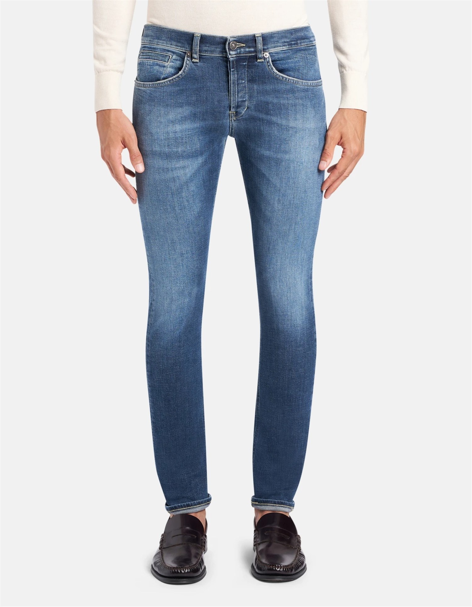 JEANS GEORGE CINQUE TASCHE SKINNY FIT, VITA BASSA, TASCHINO A FILETTO. DENIM STRETCH RESPONSABILE BLU 13 1/4 OZ. LAVAGGIO MEDIO SCURO PULITO GOTS. LOGO DONDUP. MADE IN ITALY