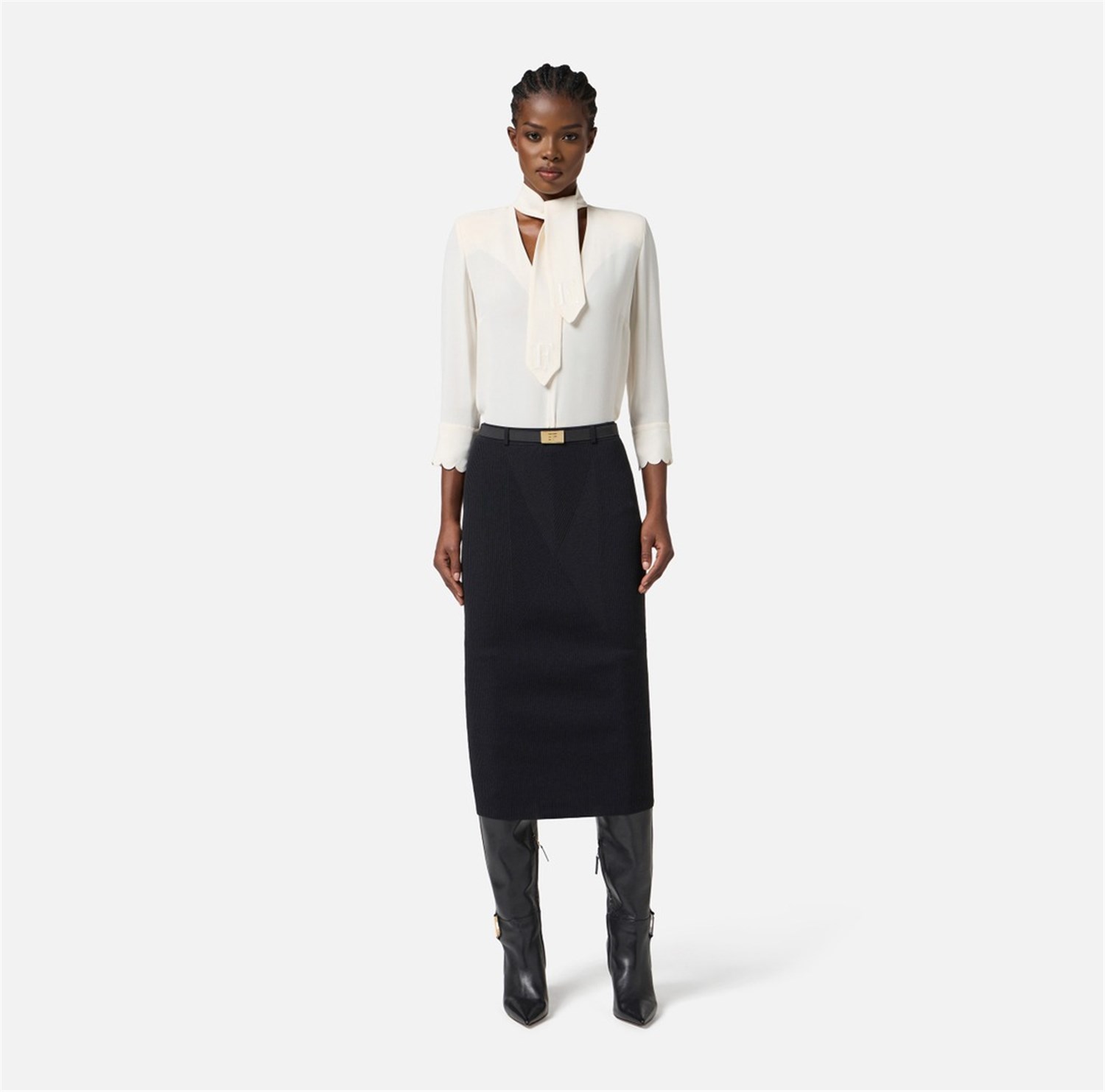 Gonna in maglia dalla vestibilità aderente. Si distingue per la lavorazione a costine che disegna la silhouette con motivi geometrici sul davanti. La cintura impreziosita dal logo con strass è trattenuta da passanti in tono e sottolinea il punto vita.