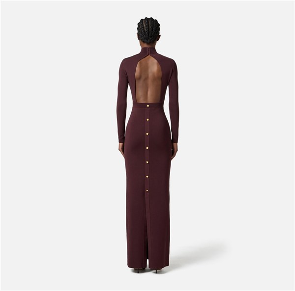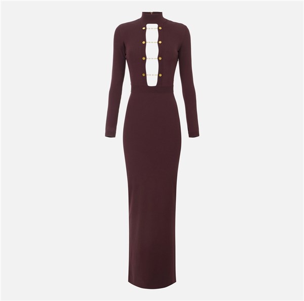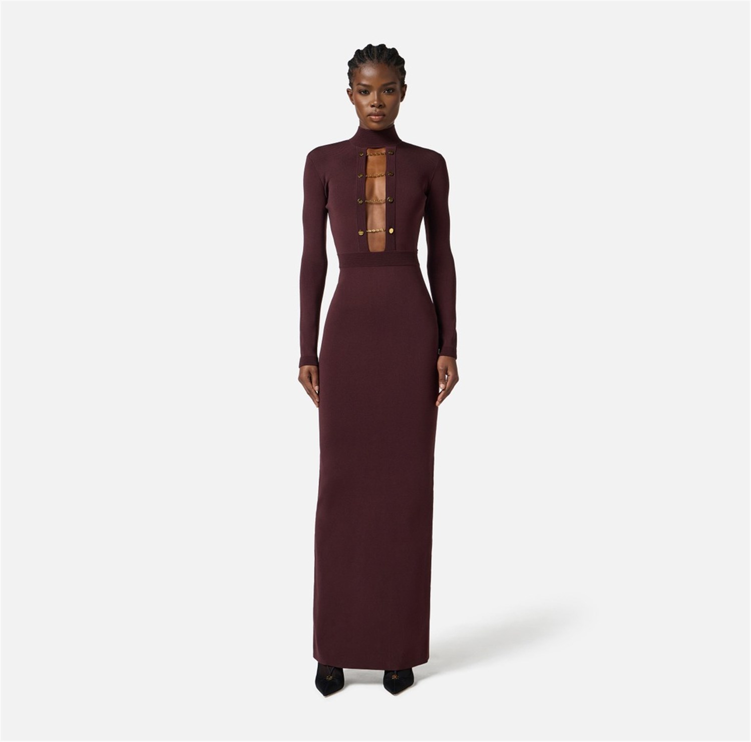 Abito lungo in maglia di viscosa dalla vestibilità aderente. Il vestito ha collo alto e maniche lunghe. Si distingue per lo scollo profondo, impreziosito da gemelli gioiello con catena in metallo dorato. Il retro rivela un oblò sulla schiena e una spacco sulla gonna, arricchito da bottoni con logo.