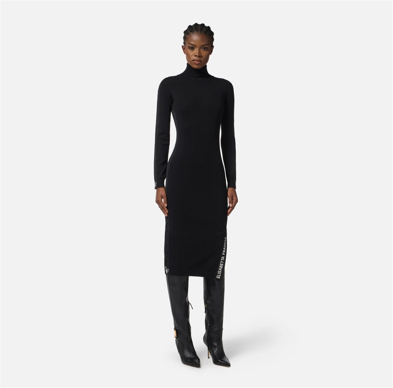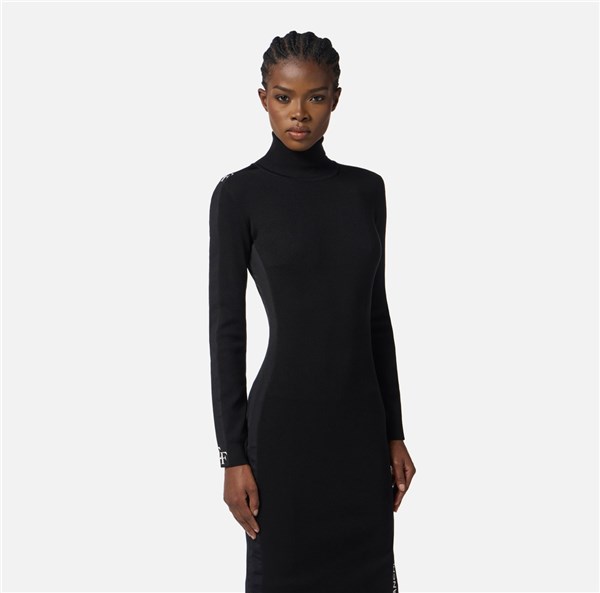 Abito a tubino in maglia dalla vestibilità aderente. Il vestito ha collo alto, maniche lunghe e si distingue per lo spacco laterale sormontato dalla banda in viscosa lucida. I dettagli logo resi da intarsi e colori a contrasto elevano il design essenziale del capo con una nota grafica.