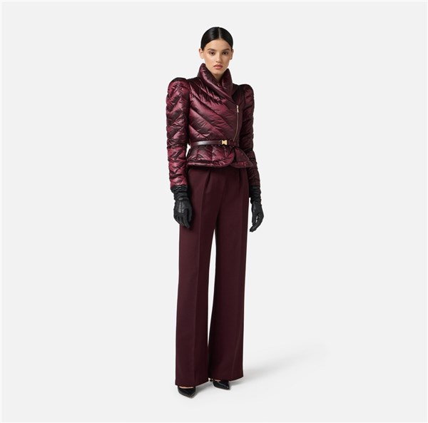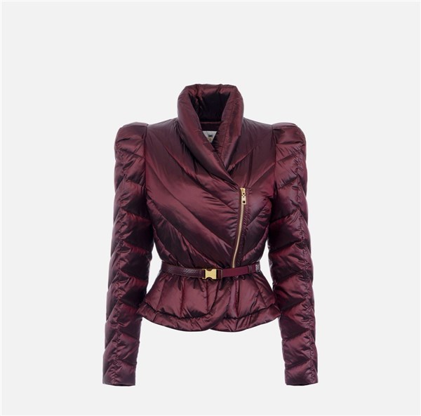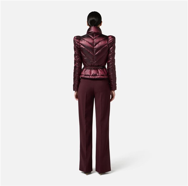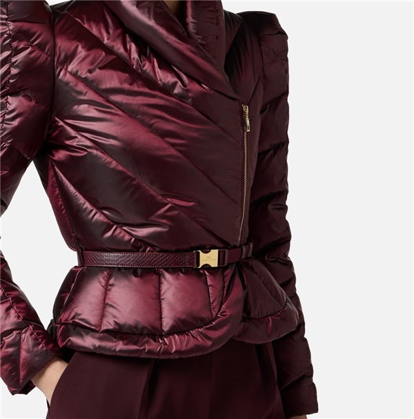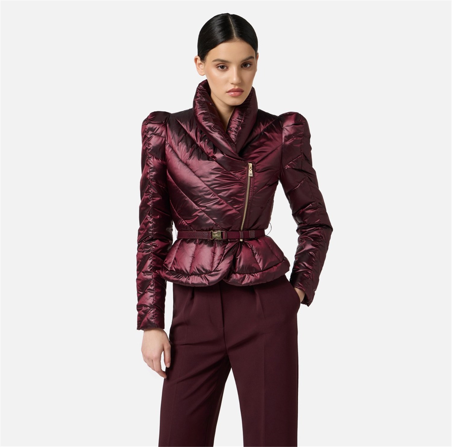 Piumino corto in tessuto vela dalla luminosa texture cangiante. Imbottito e trapuntato con motivi chevron, si distingue per il collo alto sovrapposto e per le maniche con spalle bombate dai leggeri motivi di arricciatura. La baschina definita dalla cintura con fibbia esalta la linea femminile del capo. Vestibilità slim.