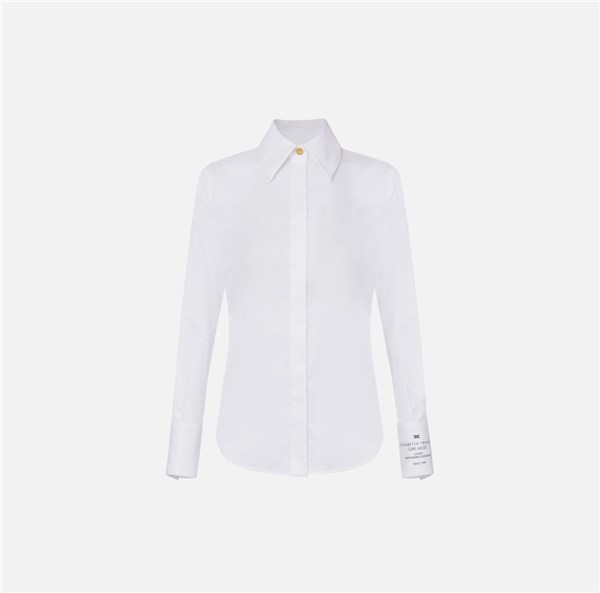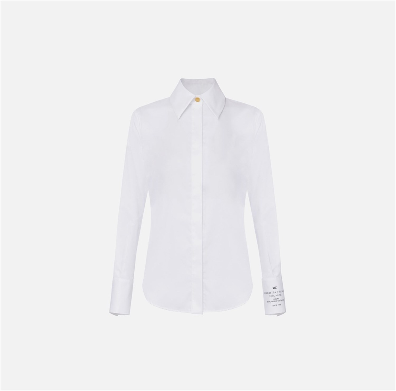 Camicia in popeline di cotone dalla vestibilità aderente. Il capo ha colletto classico impreziosito dal bottone a vista in metallo dorato. Le maniche hanno polsini alti, di cui uno personalizzato dalla stampa di collezione in colore a contrasto.