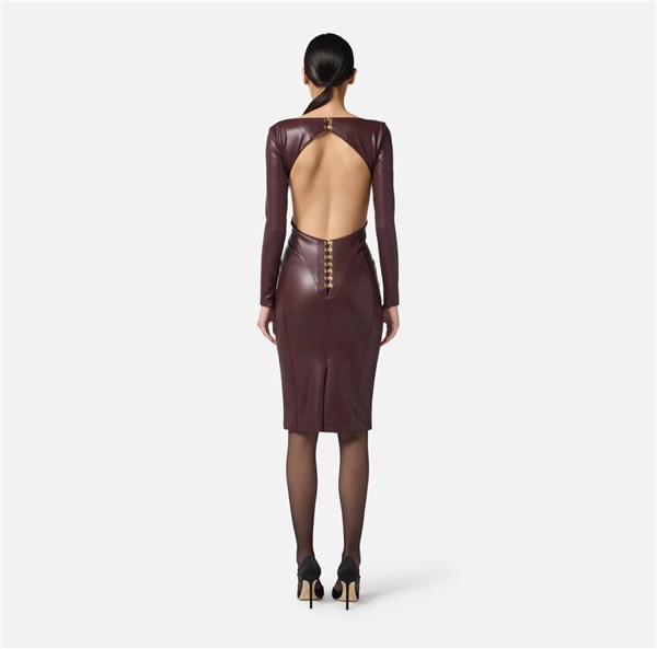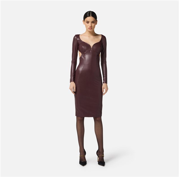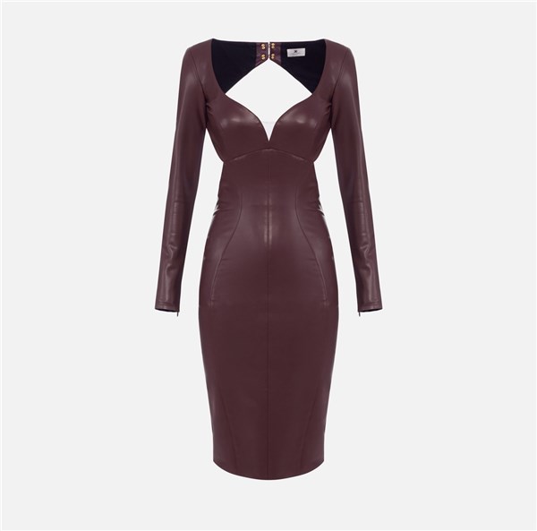 Abito realizzato in materiale sintetico effetto nappa. Il vestito ha maniche lunghe e si distingue per i tagli cut-out sui fianchi e per l'oblò sul retro, definito da ganci in metallo dorato che aggiungono luce. Lo spacco sul retro esalta l'eleganza audace del capo. Vestibilità aderente.