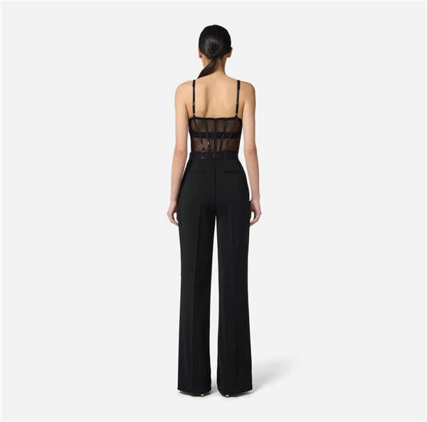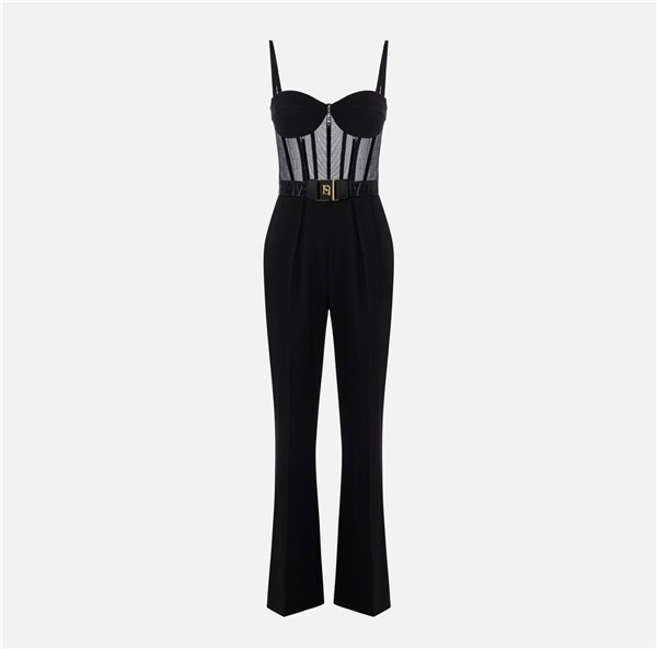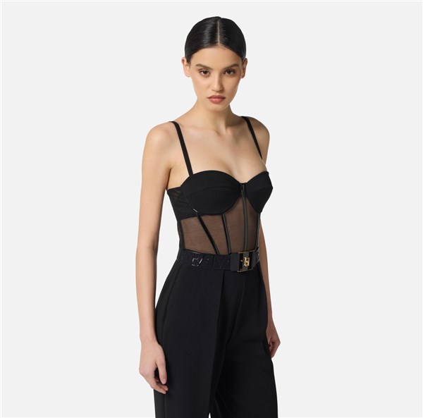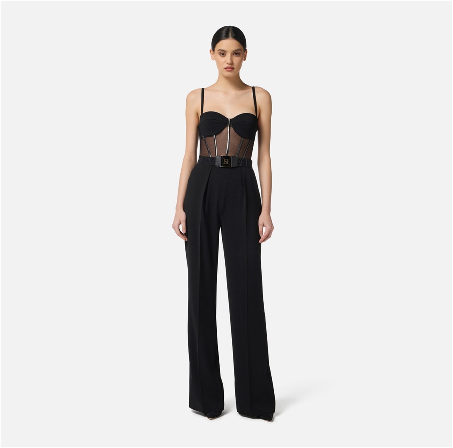 Tuta in crêpe leggero e tulle dalla vestibilità regular. Con spalline e coppe rigide dalla texture opaca, ha top con costruzione a bustier definita da luminosi dettagli in vinile. I pantaloni hanno pinces sul davanti per un contrasto definito di texture e volumi. Cintura con logo sul punto vita.