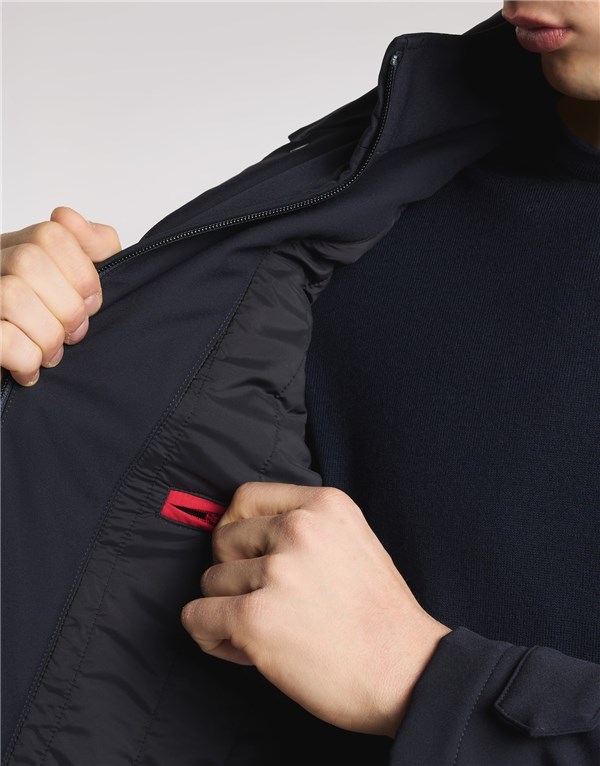 Il modello, imbottito in ovatta stretch, è dotato di alamari su fondo manica, tasche a filetto e una chiusura con zip e automatici nascosti.