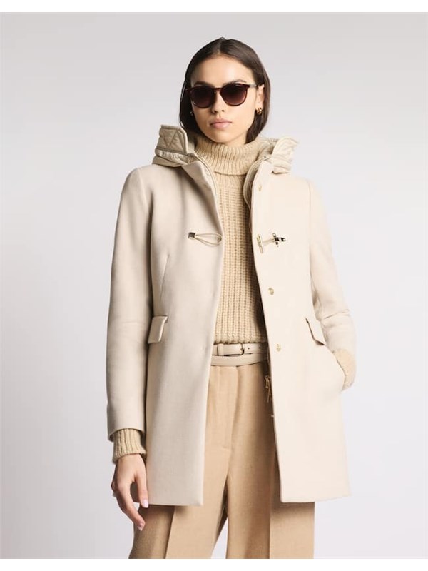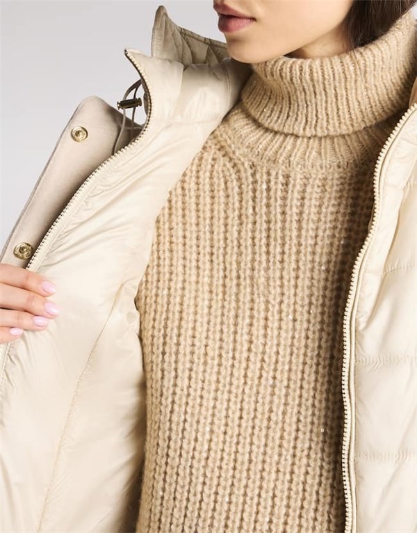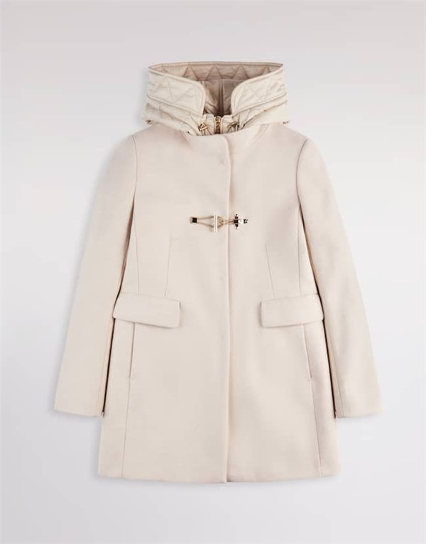 In morbido panno mélange misto lana, con pettorina e cappuccio imbottiti in ovatta tecnica, è dotato di una chiusura con zip, automatici nascosti e alamaro Fay. È caratterizzato da un'etichetta interna con il nome del capo.