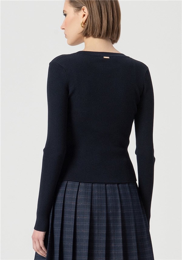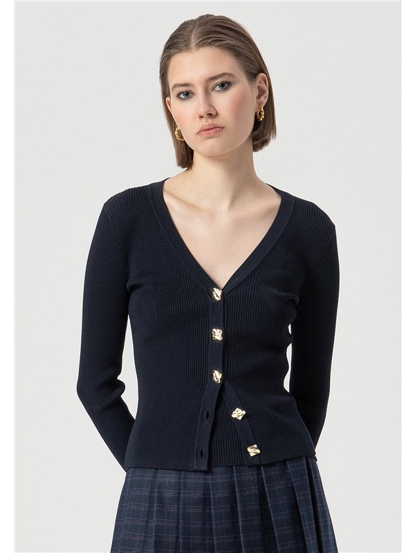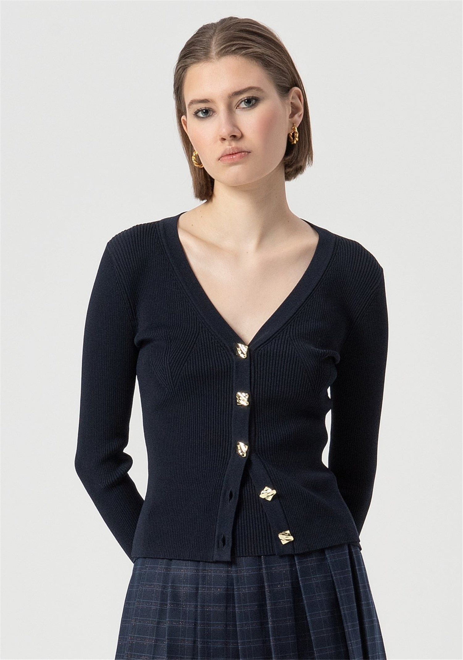 Cardigan slim a coste, scollo a V, bottoni gioiello per apertura, e con maniche lunghe.