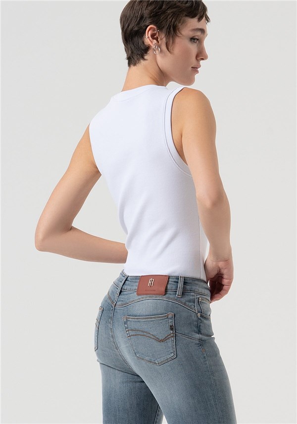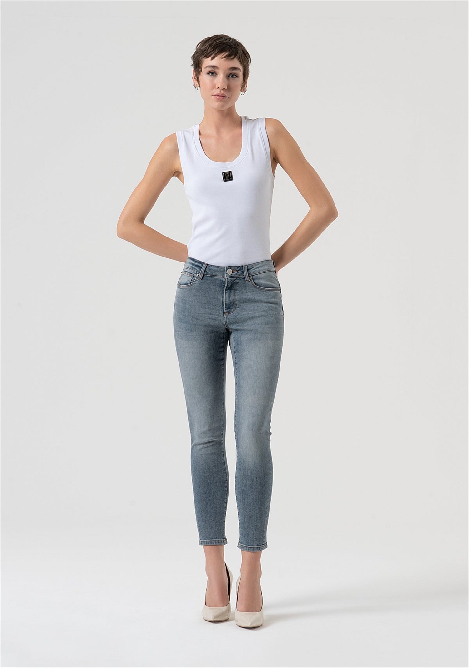 Jeans slim effetto push up in denim stretch blu grey con lavaggio medio, vita regolare, 5 tasche, e con fondo stretto.