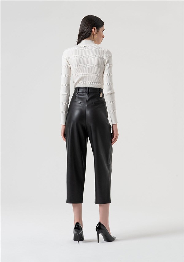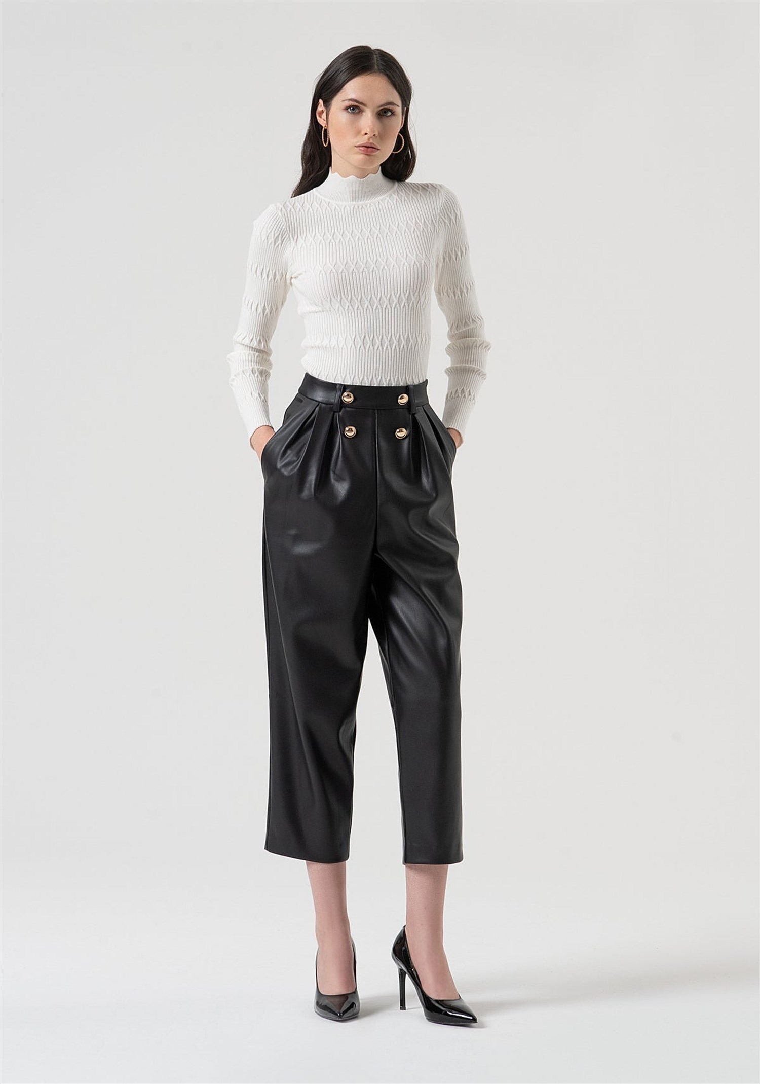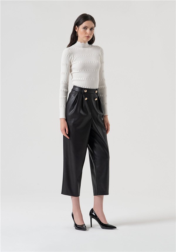 Pantalone carrot con vita alta, in finta pelle, doppia pences, bottoni applicati sul davanti, tasche alla francese, tasche a filetto sul retro, e con fondo dritto.