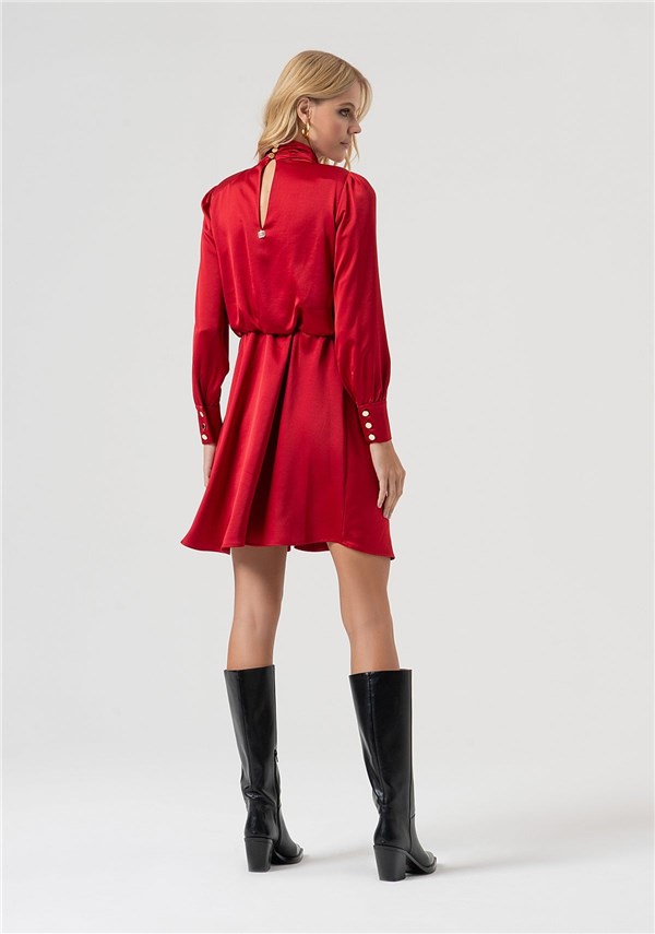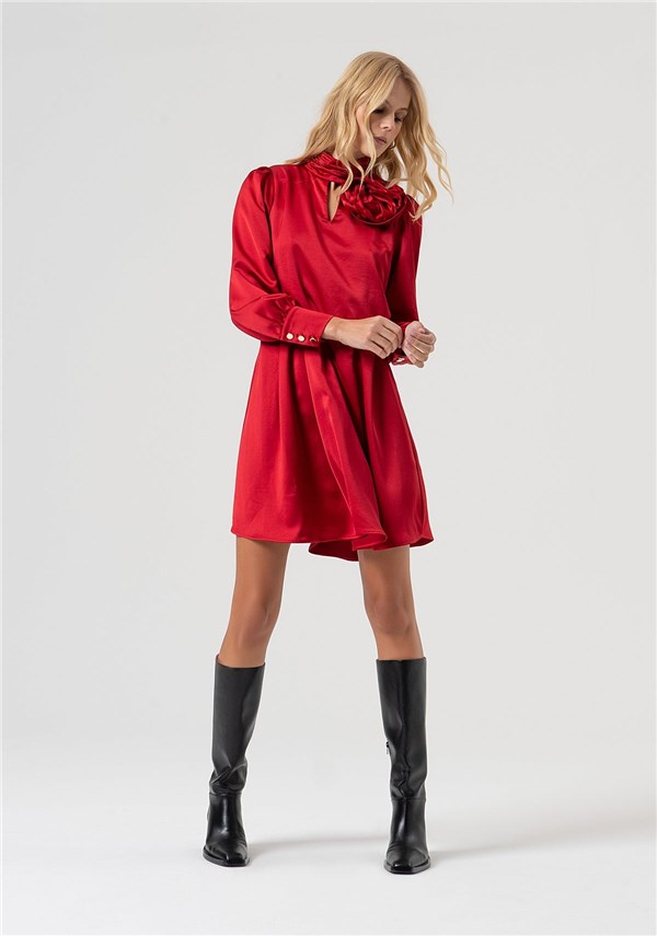 Abito regular in raso, goccia sul davanti, applicazione fiore sul lato sinistro, maniche lunghe a sbuffo, e con gonna svasata mini.