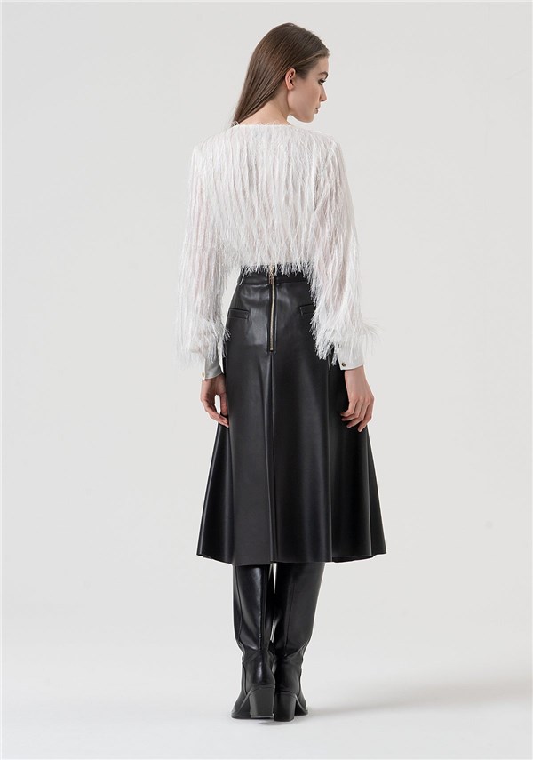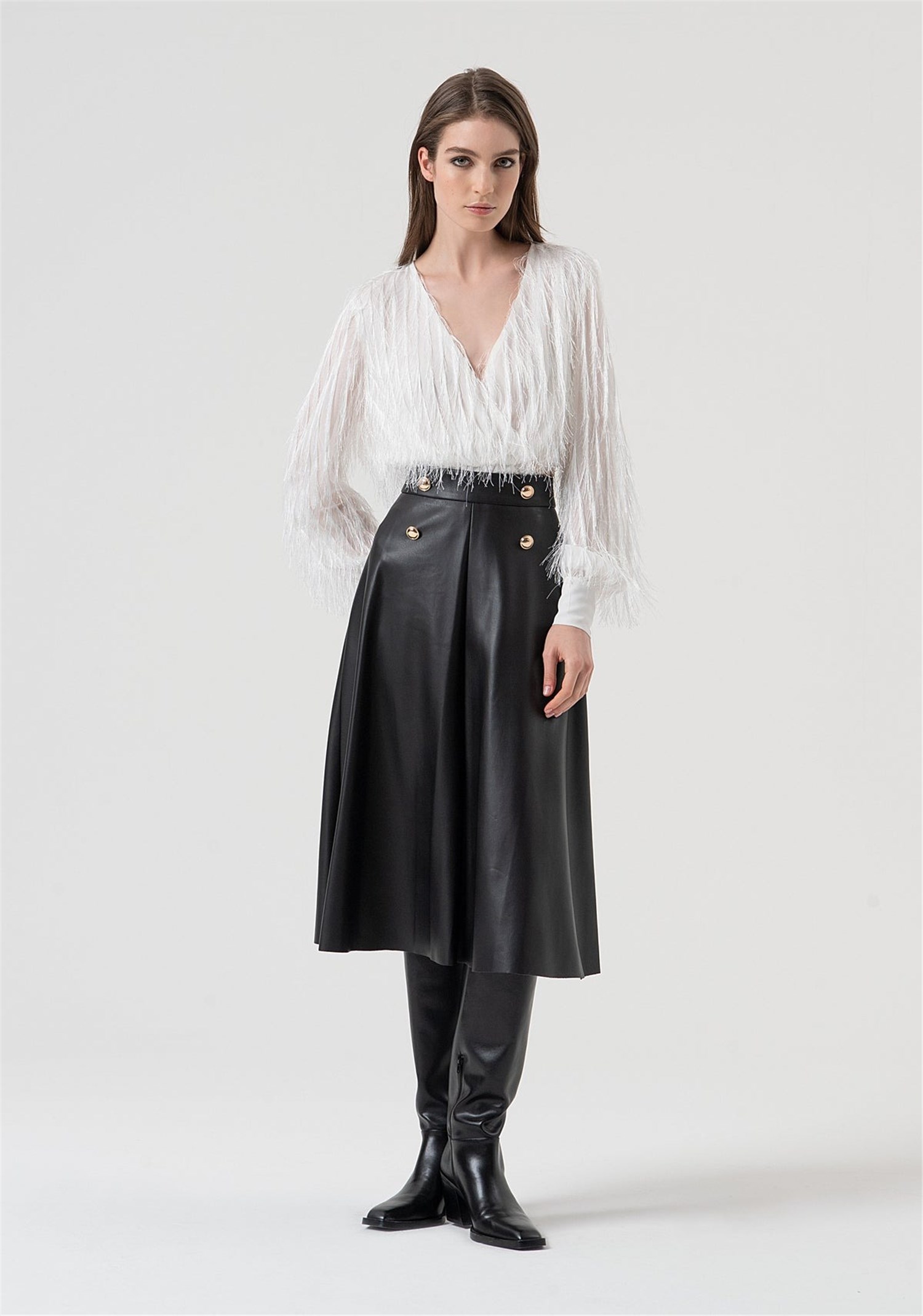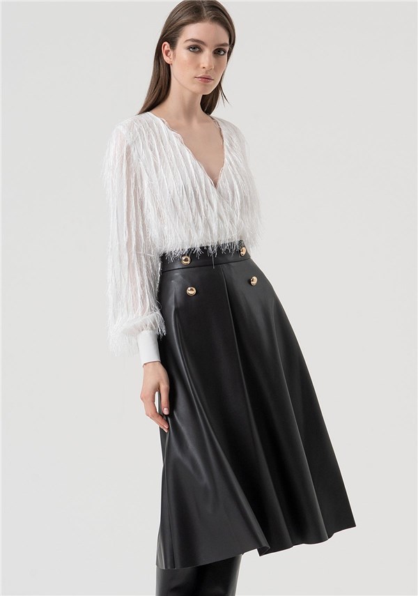 Gonna flare midi a vita alta, in finta pelle, zip sul retro per apertura, e con bottoni decorativi metallici sul davanti.