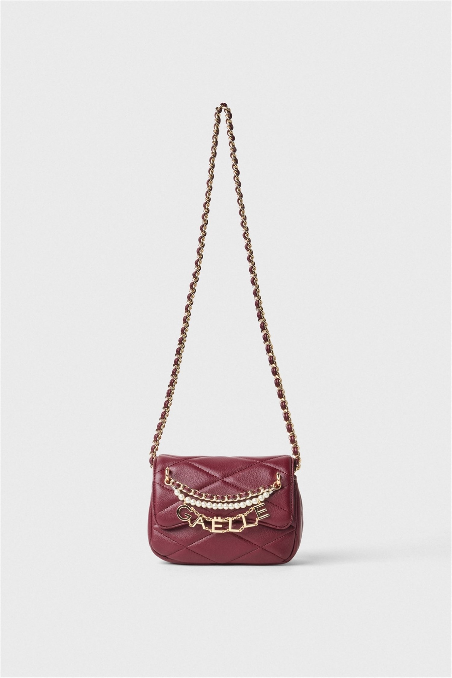 Modello in ecopelle matelassè, impreziosito da charms e logo dorato con perle, patta con chiusura automatica.