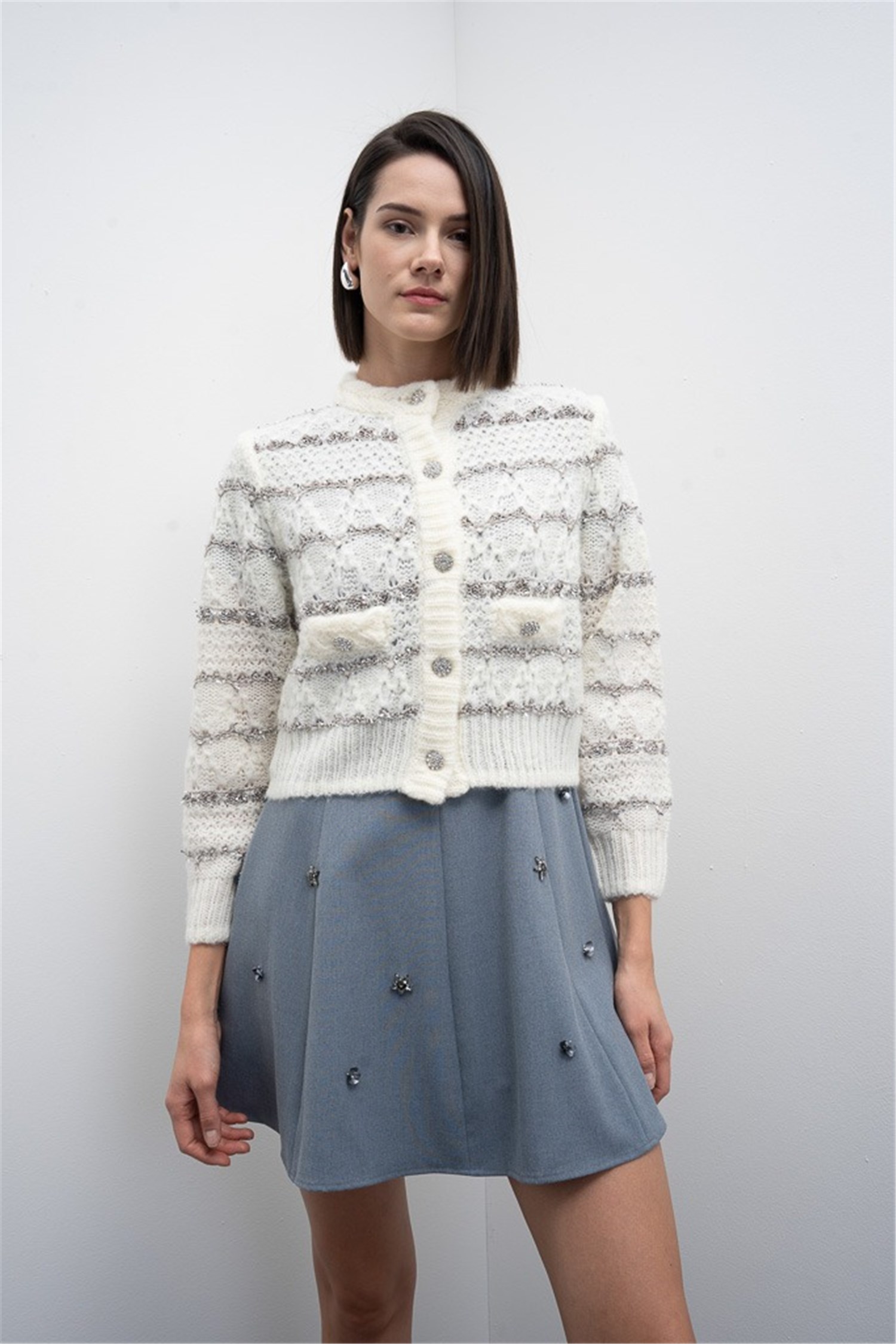 - Chiusura frontale con bottoni gioiello luminosi.
