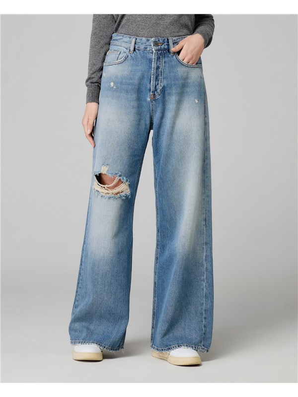 Modello cinque tasche in denim puro cotone, presenta strappi sul davanti, blu wash.