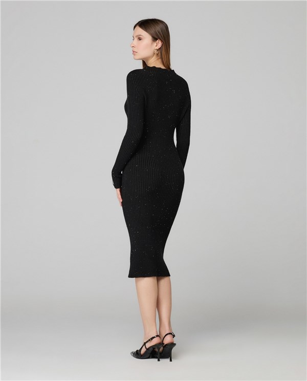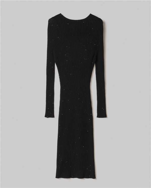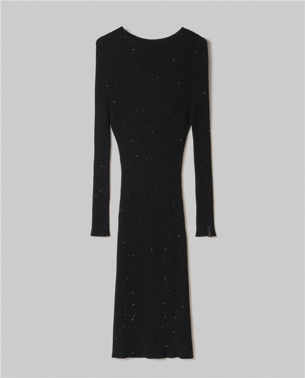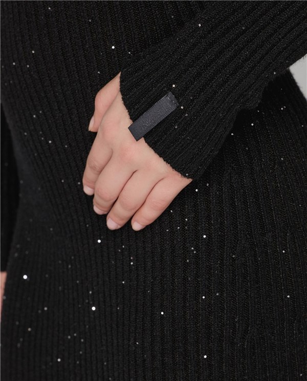 Modello realizzato in maglia misto viscosa con lavorazione a costina e paillettes ricamate, tinta unita, manica lunga, vestibilità slim.